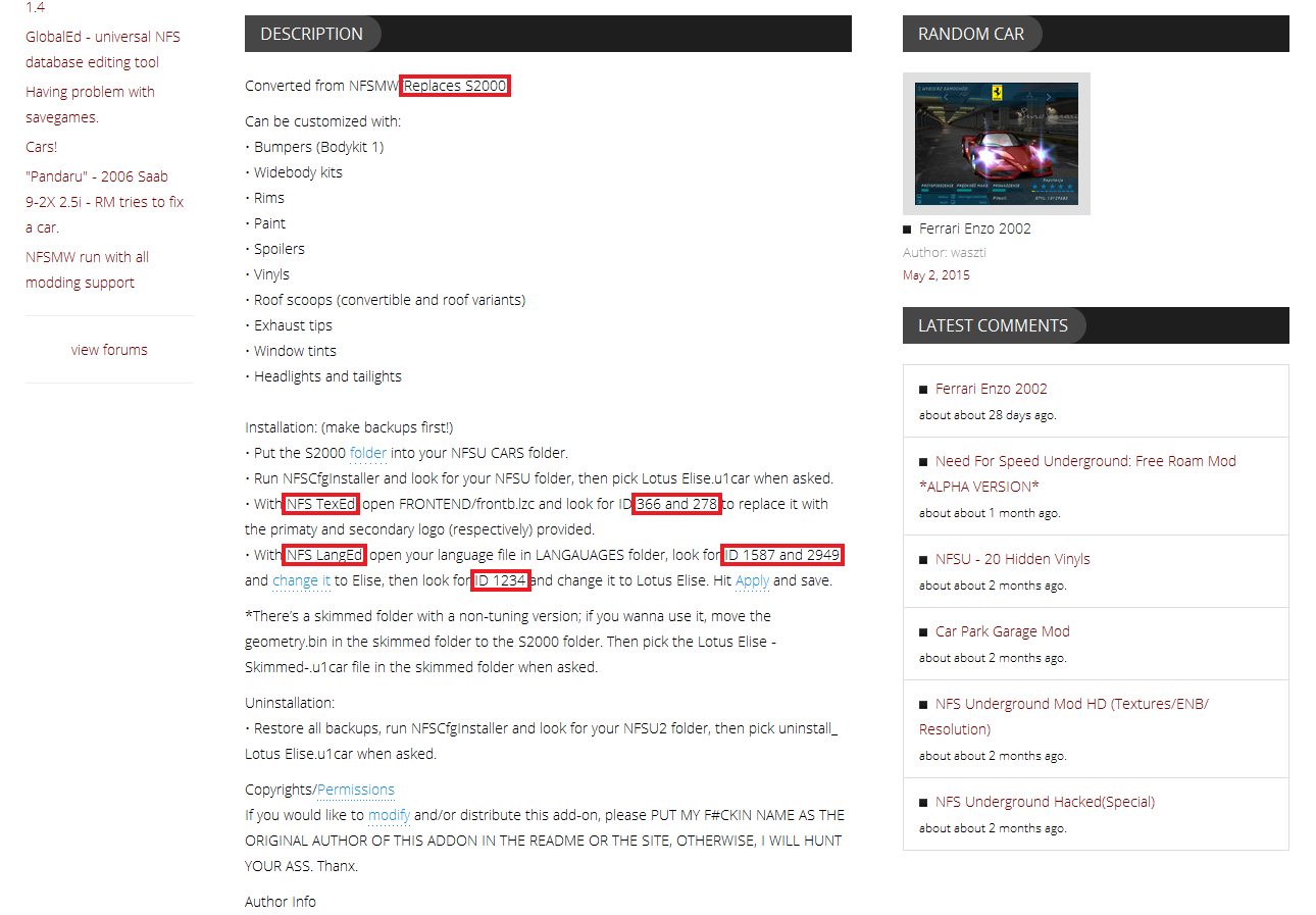 1. Na stronie NFSCars.net wyszukujemy interesujący nas model, np. Lotus Elise. W panelu Descriptions na stronie internetowej sprawdzamy jaki model zostanie zastąpiony (z ang. replaces) po tej modyfikacji, oraz wyszukujemy ewentualnych numerów linii pod którymi kryją się loga producenta i modelu oraz samochodu - czasami znajdują się one dopiero w archiwum z samochodem. Może się zdarzyć, że będziemy musieli poświęcić już zmodyfikowany model. W tym przypadku to oryginalna Honda S2000.