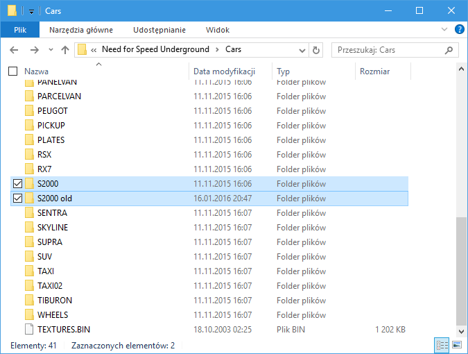 4. Tworzymy kopię zapasową folderu samochodu, który zostanie zastąpiony w grze, (NFSUnderground\Cars\model-samochodu) np. poprzez dodanie do nazwy folderu słowa old. W tym przypadku folder S2000 zmieniamy na S2000 old.