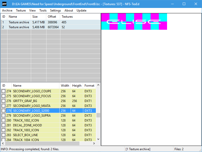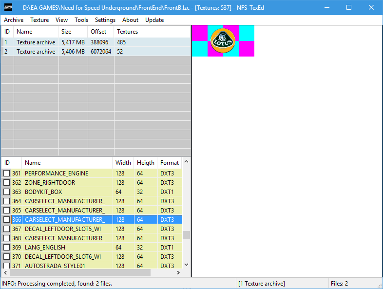 6. Uruchamiamy NFS-TexEd.exe. Klikamy na menu Archive i wybieramy Open. Odszukujemy FrontB.lzc w NFS Underground\FrontEnd i klikamy Otwórz.