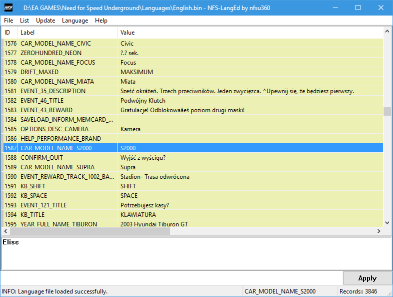 9. Teraz Uruchamiamy NFS-LangEd.exe w celu zmiany nazwy pojazdu pojawiającej się podczas wyścigów. Klikamy na menu File i wybieramy Open. Odszukujemy plik English.bin w NFS Underground\Languages i klikamy Otwórz. Odszukujemy pozycje, pod którymi kryją się nazwy zastępowanego modelu (w tym przypadku są to wymienione w Descriptions pozycje nr 1587 i 2949). Obie nazwy edytujemy dwukrotnie na nie klikając i wpisując w dolnej części okna nazwę modelu (Elise) i klikamy Apply.