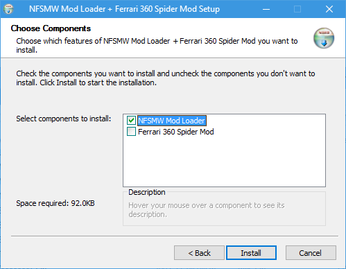 5. Teraz instalujemy NFSMW Mod Loader (możemy odznaczyć instalację Ferrari 360 Spider Mod).