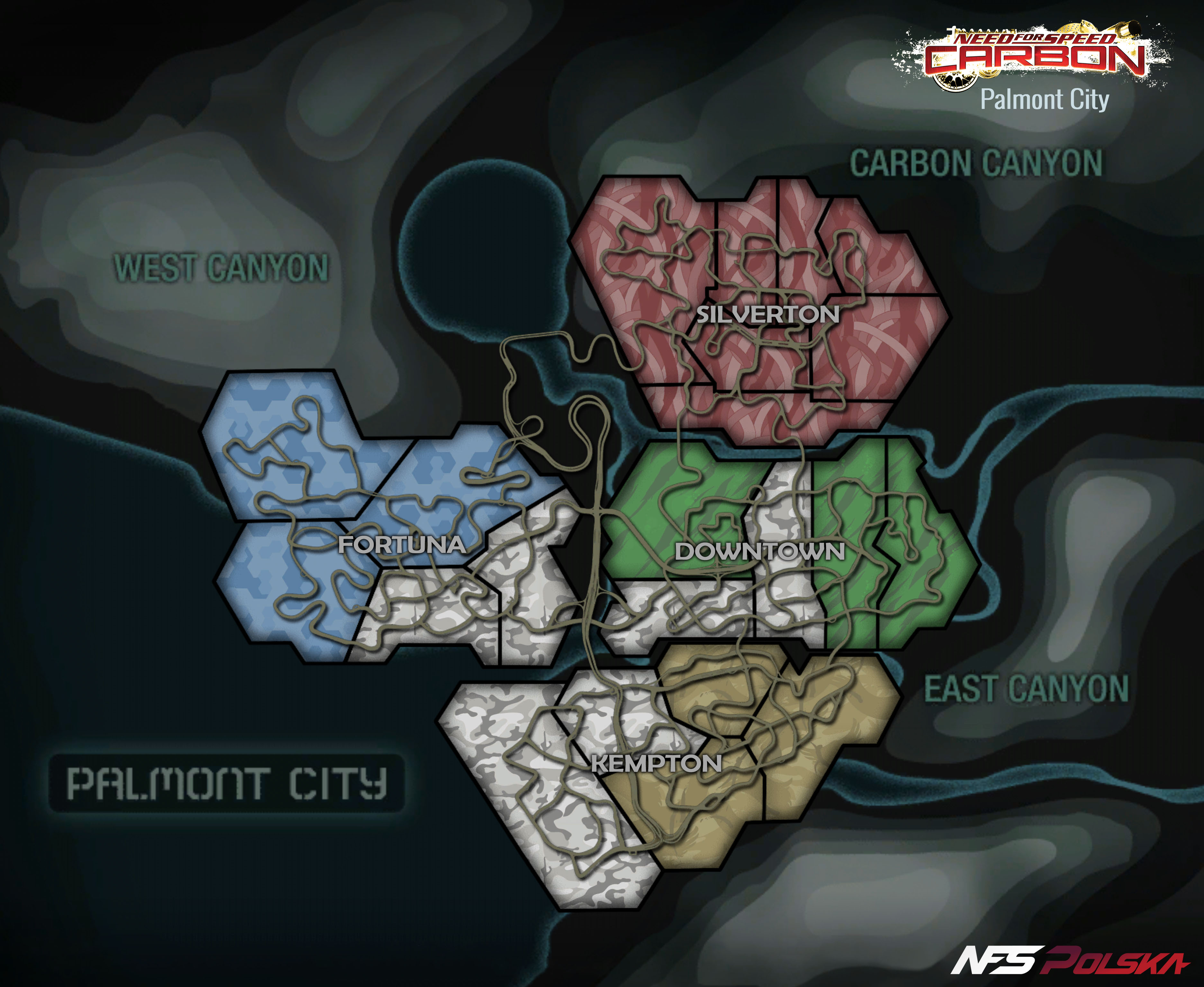 Obszar dostępny w Need for Speed Carbon możemy podzielić na dwie części: składające się z czterech dzielnic (Downtown, Kempton, Fortune i Silverton) Palmont City oraz kaniony rozlokowane na obrzeżach miasta. Każdą dzielnicą rządzi inny gang. Na początku gry możemy eksplorować trzy dzielnice. Ostatnia z nich (Silverton), rozlokowana na północy, jest dostępna dopiero po pokonaniu bossów Angie, Kenji i Wolfa. Z kanionów korzystamy wyłącznie podczas wyścigów - oficjalnie nie ma możliwości swobodnego ich zwiedzania podczas jazdy dowolnej.