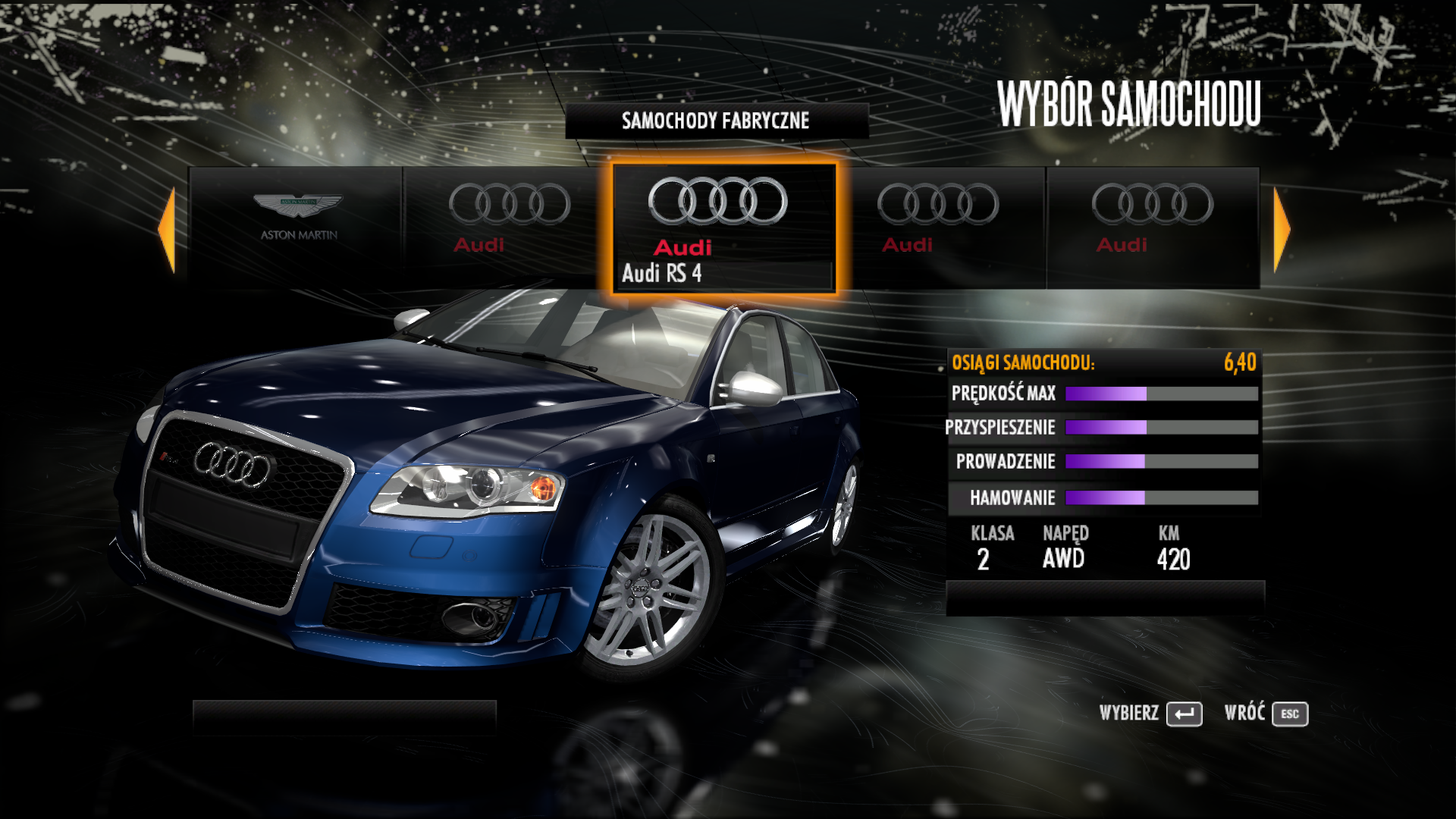 | Audi RS 4 | 2 | Europejska | 70,000 | AWD | 30 gwiazdek | Podstawowa wersja gry | |