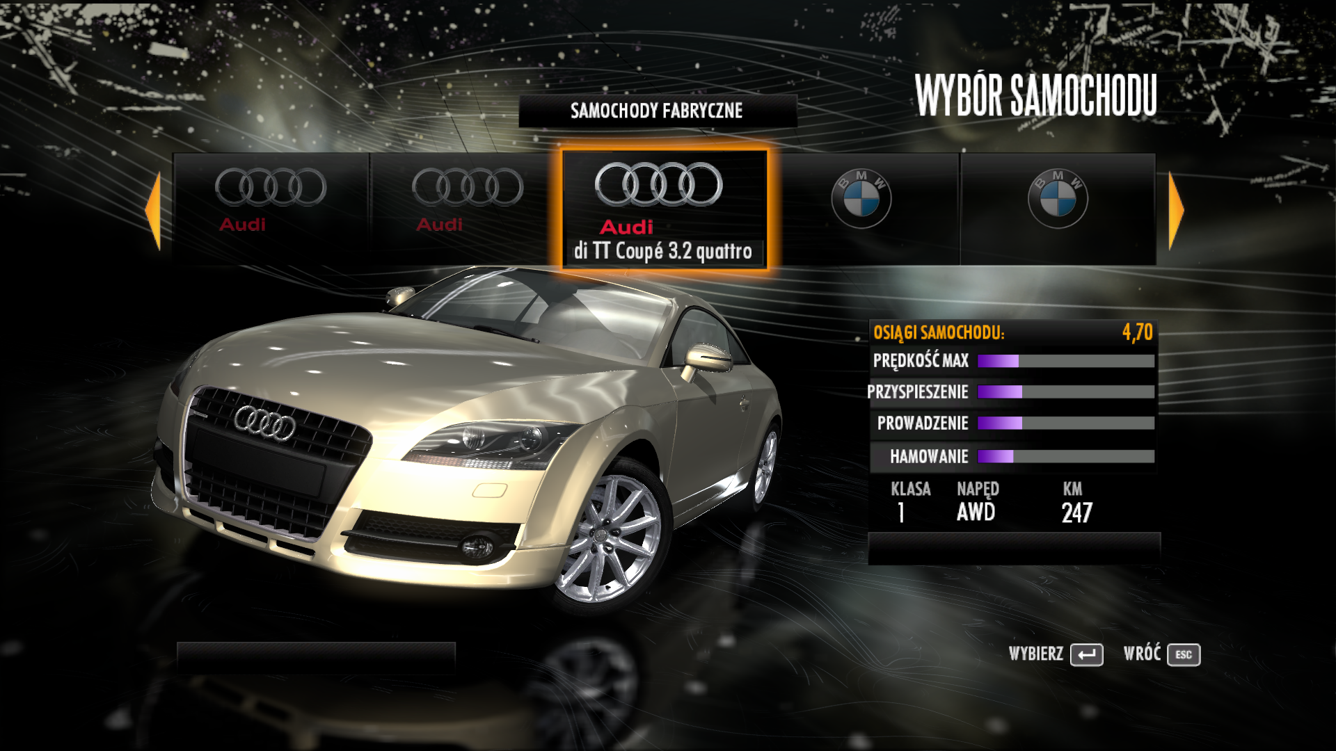 | Audi TT Coupé 3.2 quattro | 1 | Europejska | 45,000 | AWD | Dostępny od początku | Podstawowa wersja gry | |