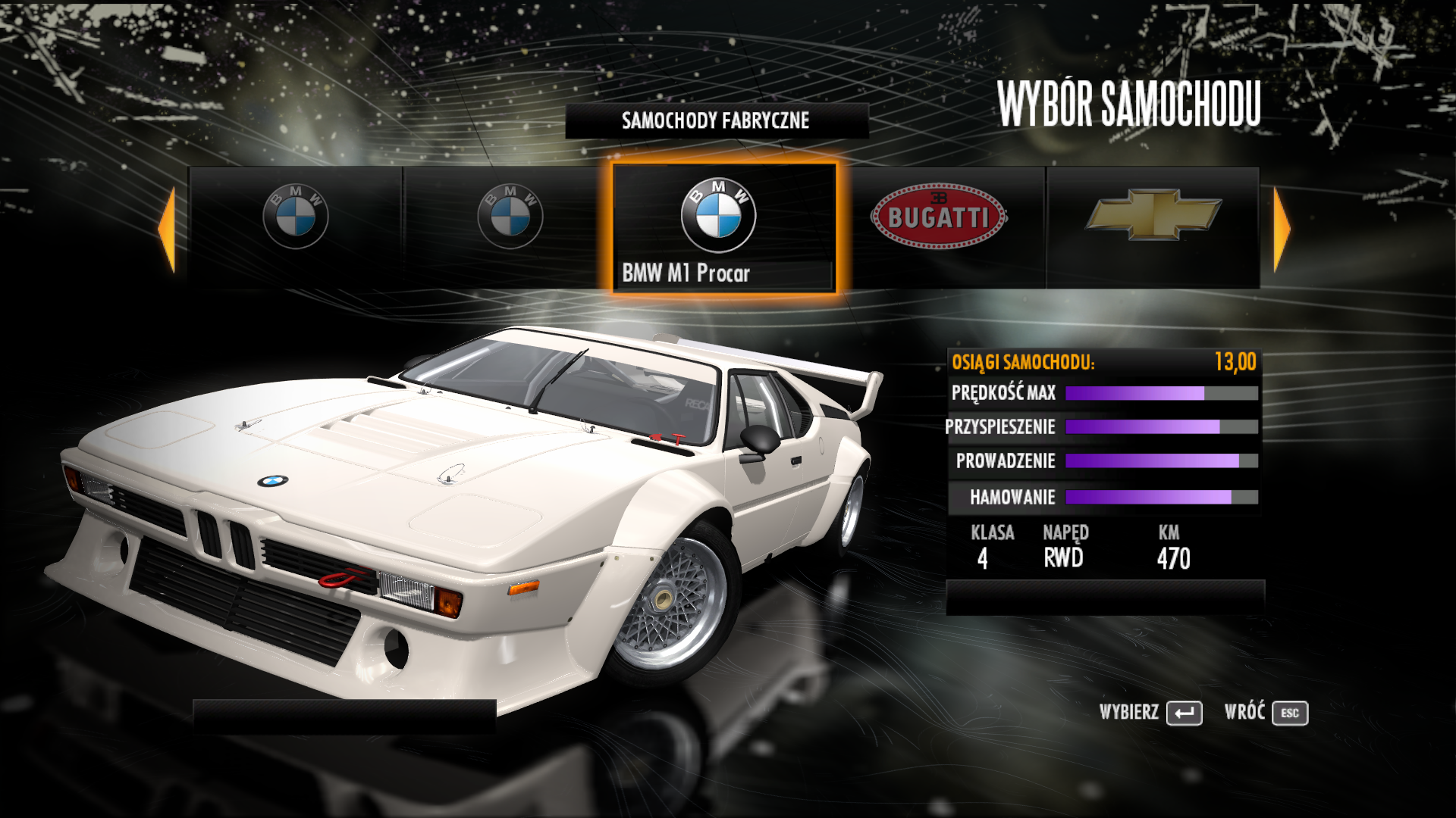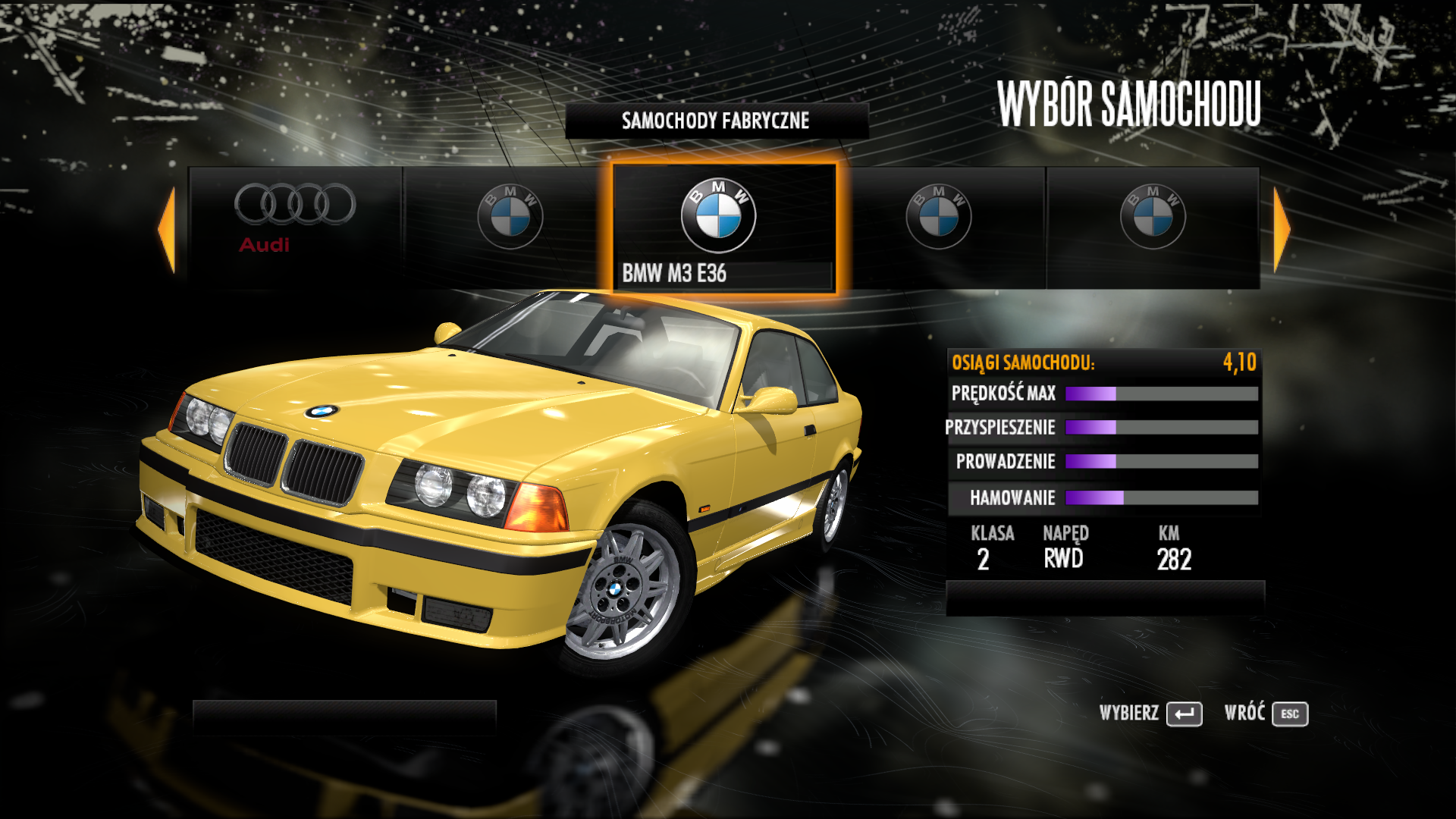 | BMW M3 E36 | 2 | Europejska | 50,000 | RWD | ✓ | 30 gwiazdek | Podstawowa wersja gry |