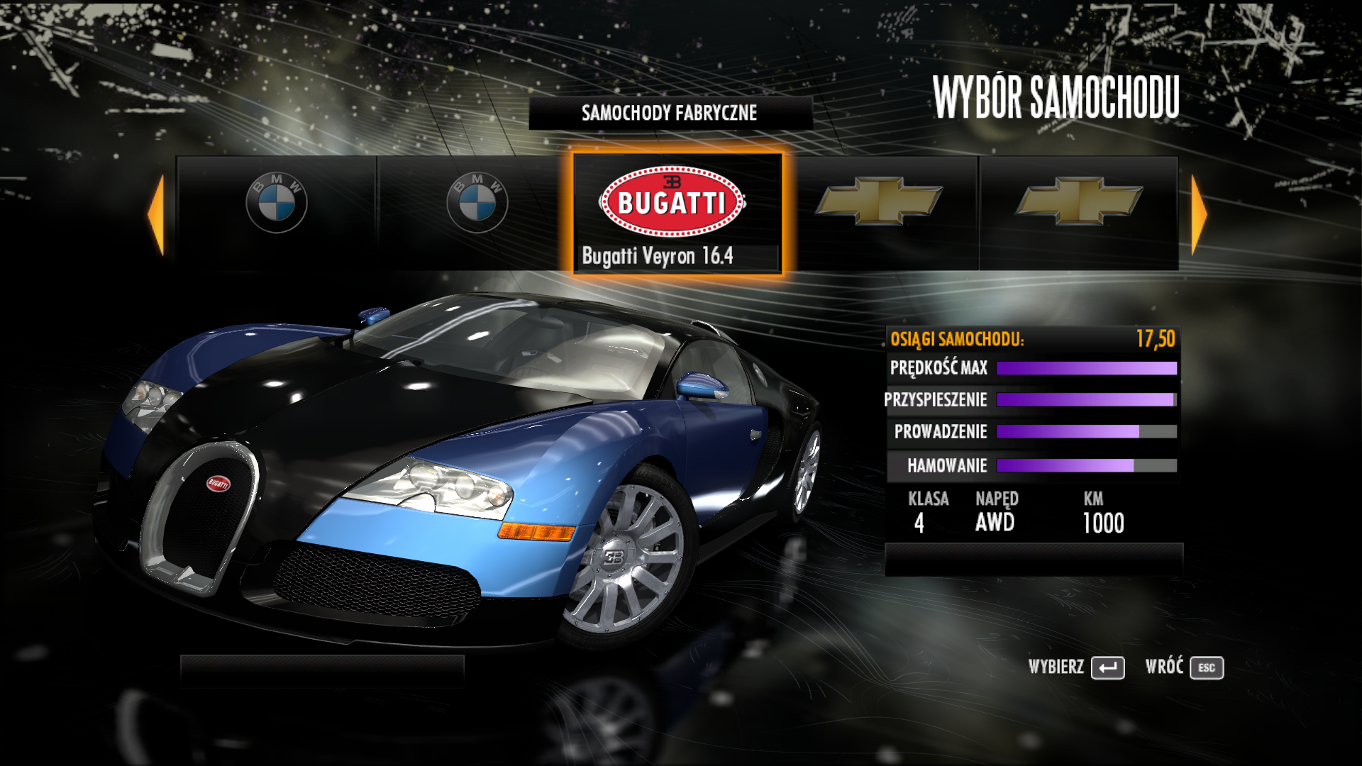 | Bugatti Veyron 16.4 | 4 | Europejska | 1,200,000 | AWD | 180 gwiazdek | Podstawowa wersja gry | |