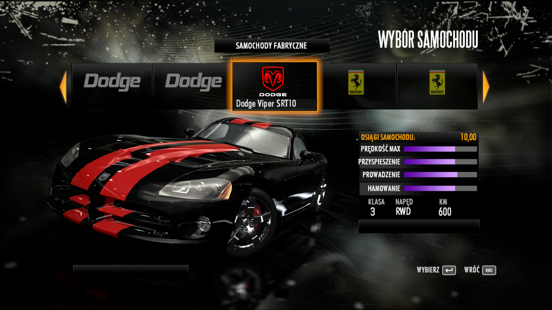 | Dodge Viper SRT10 | 3 | Amerykańska | 170,000 | RWD | ✓ | 80 gwiazdek | Podstawowa wersja gry |