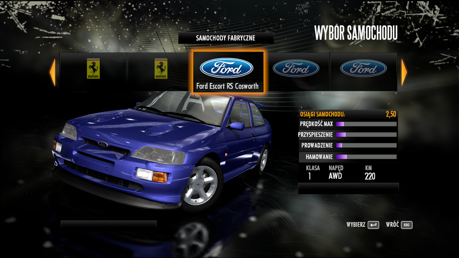 | Ford Escort RS Cosworth | 1 | Europejska | 22,000 | AWD | Dostępny od początku | Podstawowa wersja gry | |