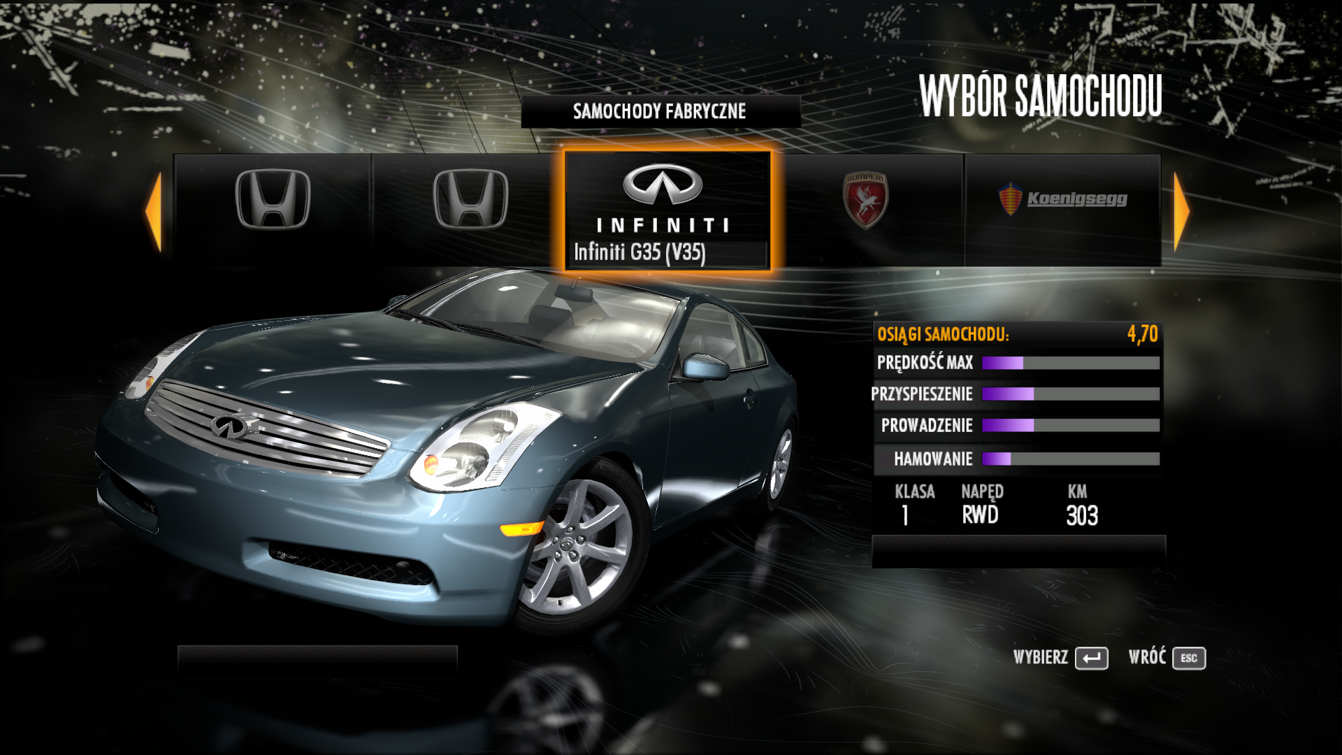 | Infiniti G35 (V35) | 1 | Japońska | 44,000 | RWD | ✓ | Dostępny od początku | Podstawowa wersja gry |