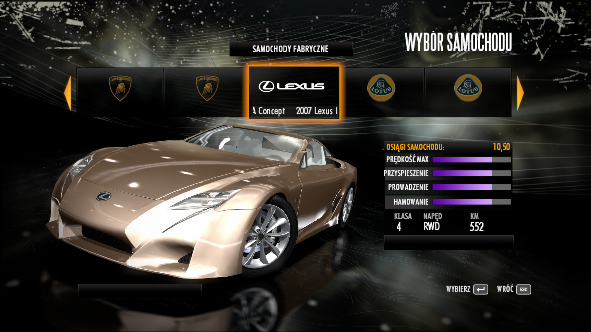 | Lexus LF-A Concept | 4 | Japońska | 420,000 | RWD | 180 gwiazdek | Podstawowa wersja gry | |
