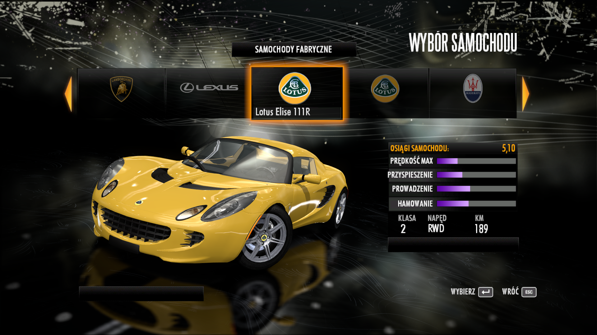 | Lotus Elise 111R | 2 | Europejska | 60,000 | RWD | 30 gwiazdek | Podstawowa wersja gry | |