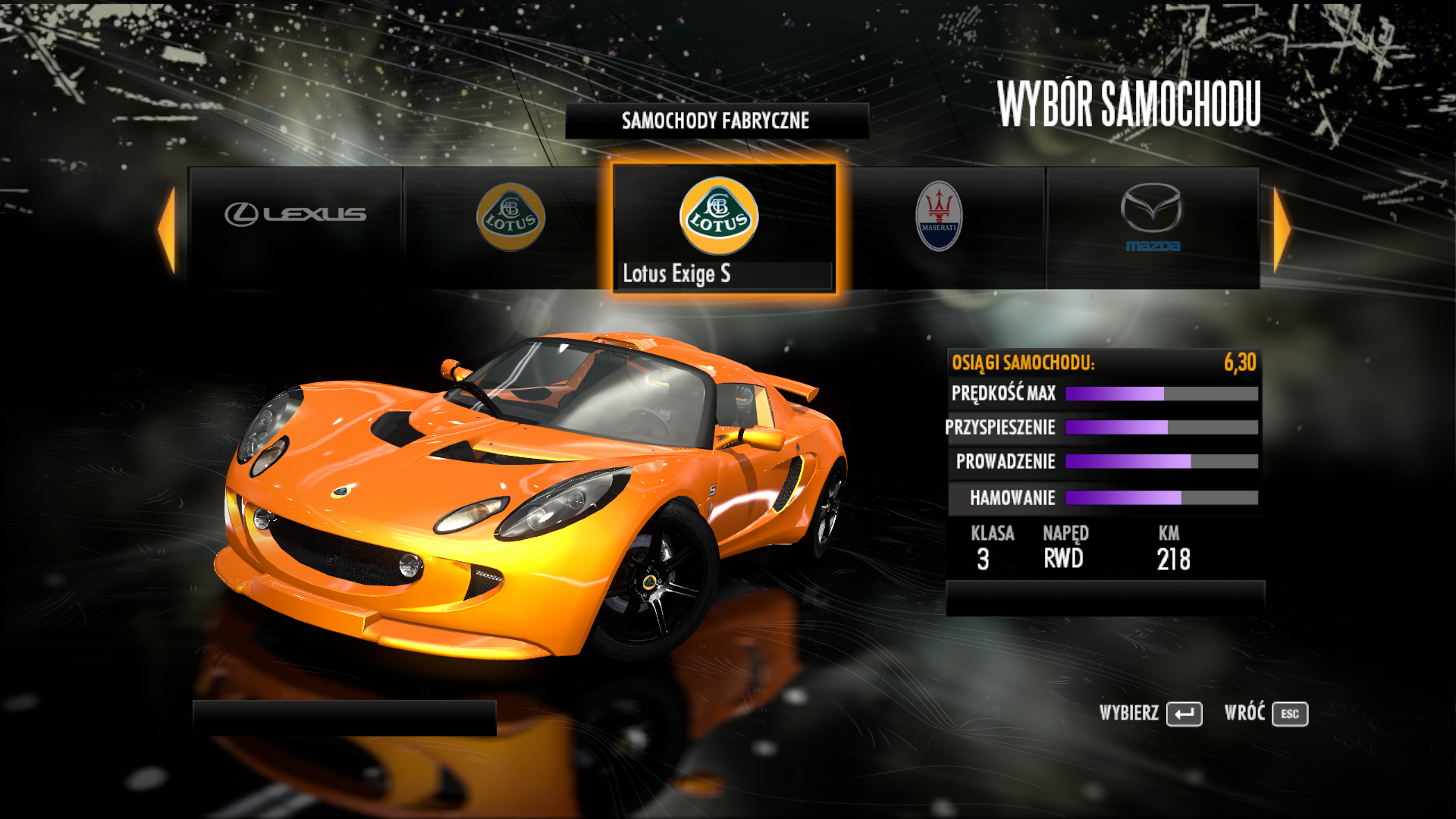 | Lotus Exige S | 3 | Europejska | 120,000 | RWD | 80 gwiazdek | Podstawowa wersja gry | |