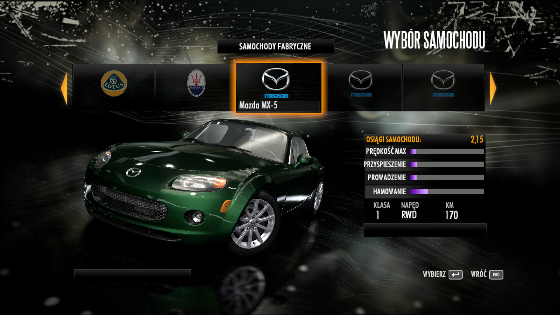 | Mazda MX-5 | 1 | Japońska | 21,000 | RWD | Dostępny od początku | Podstawowa wersja gry | |
