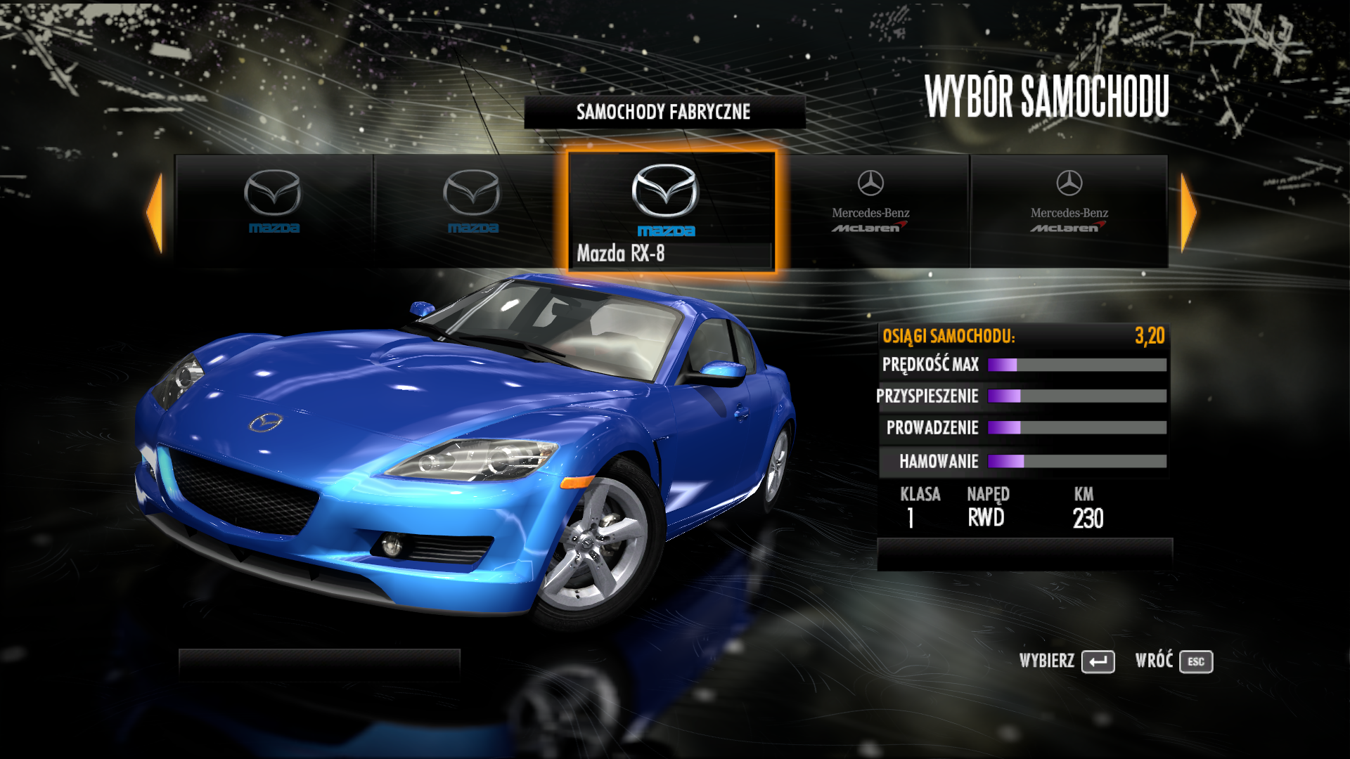 | Mazda RX-8 | 1 | Japońska | 27,000 | RWD | ✓ | Dostępny od początku | Podstawowa wersja gry |