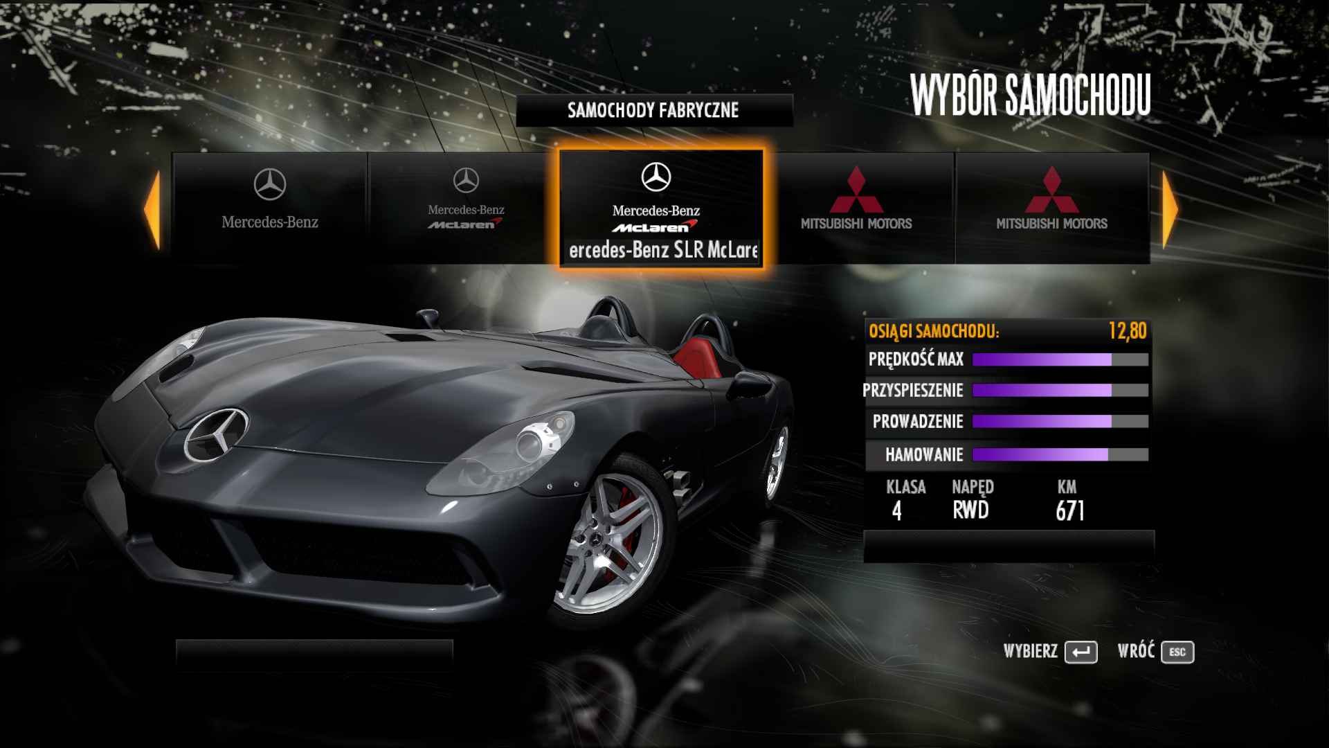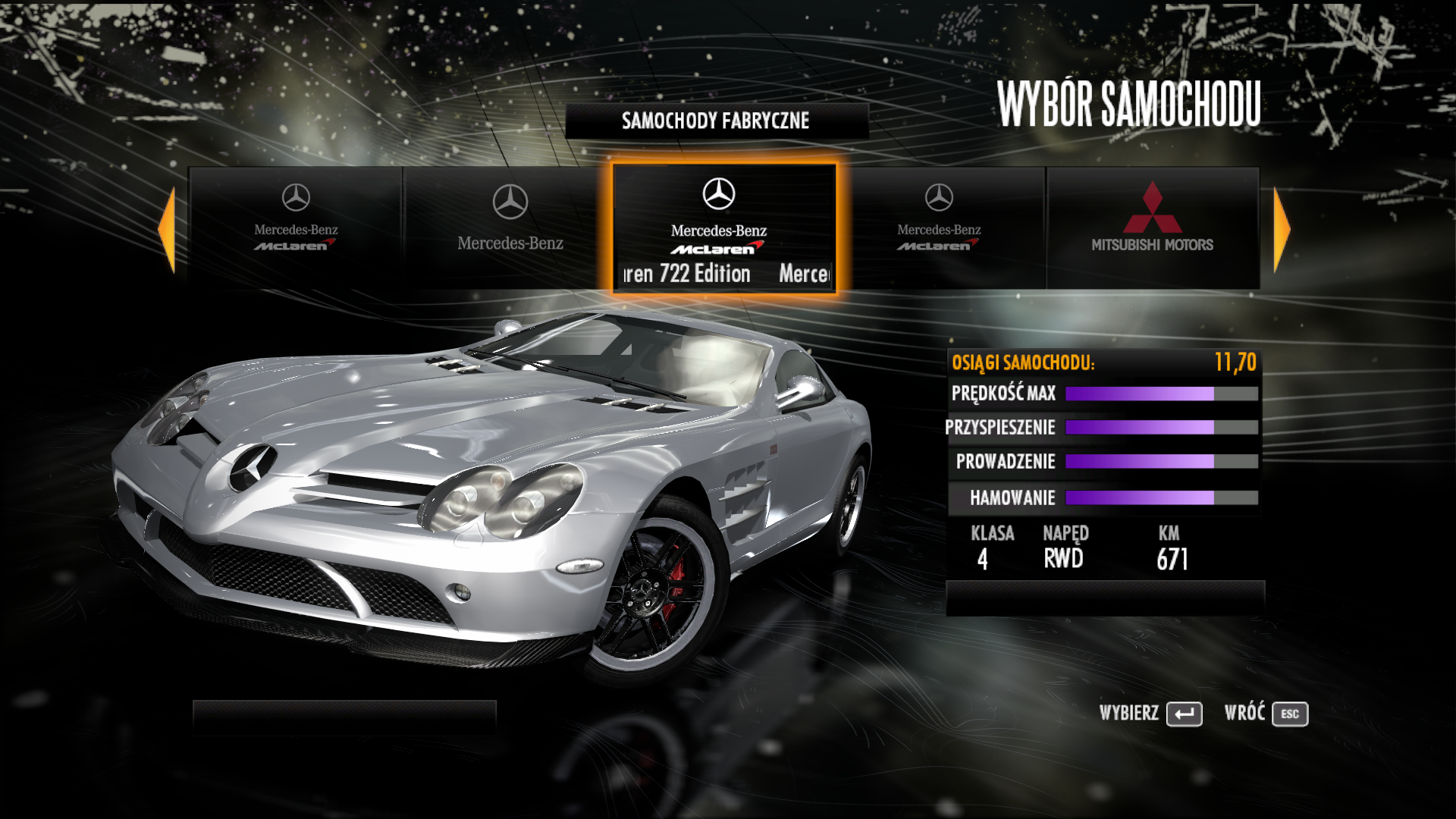 | Mercedes-Benz SLR McLaren 722 Edition | 4 | Europejska | 500,000 | RWD | 180 gwiazdek | Podstawowa wersja gry | |