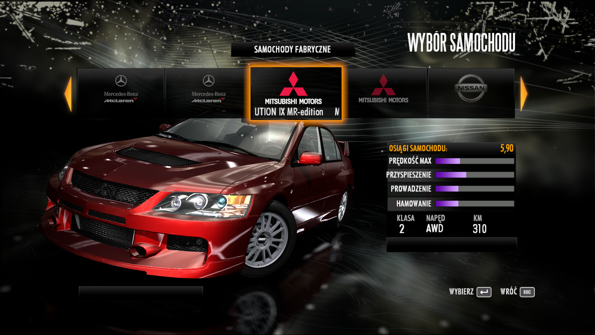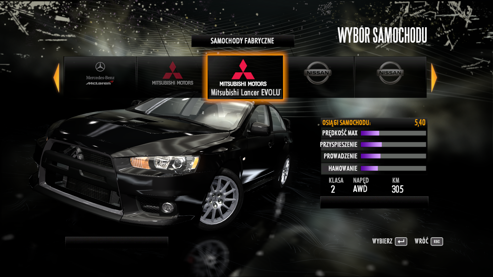 | Mitsubishi Lancer Evolution X | 2 | Japońska | 55,000 | AWD | 30 gwiazdek | Podstawowa wersja gry | |