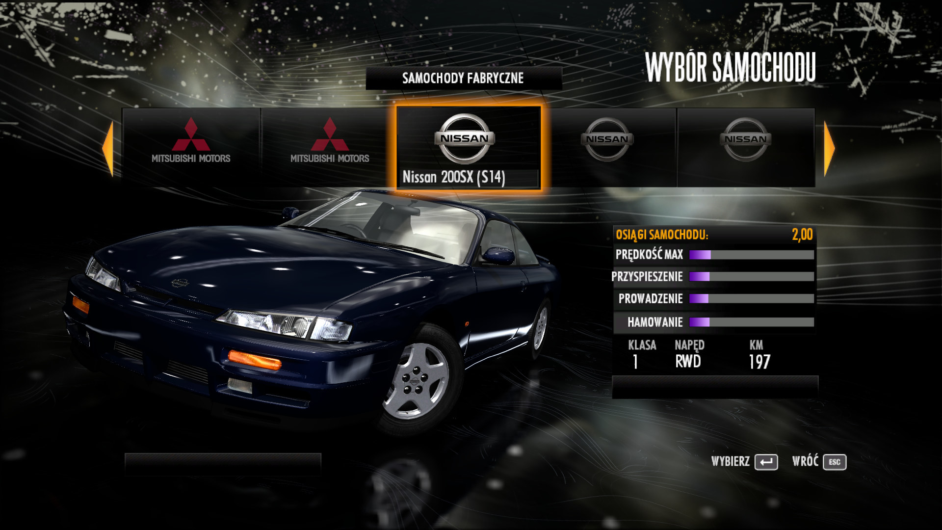| Nissan 200SX (S14) | 1 | Japońska | 20,000 | RWD | ✓ | Dostępny od początku | Podstawowa wersja gry |