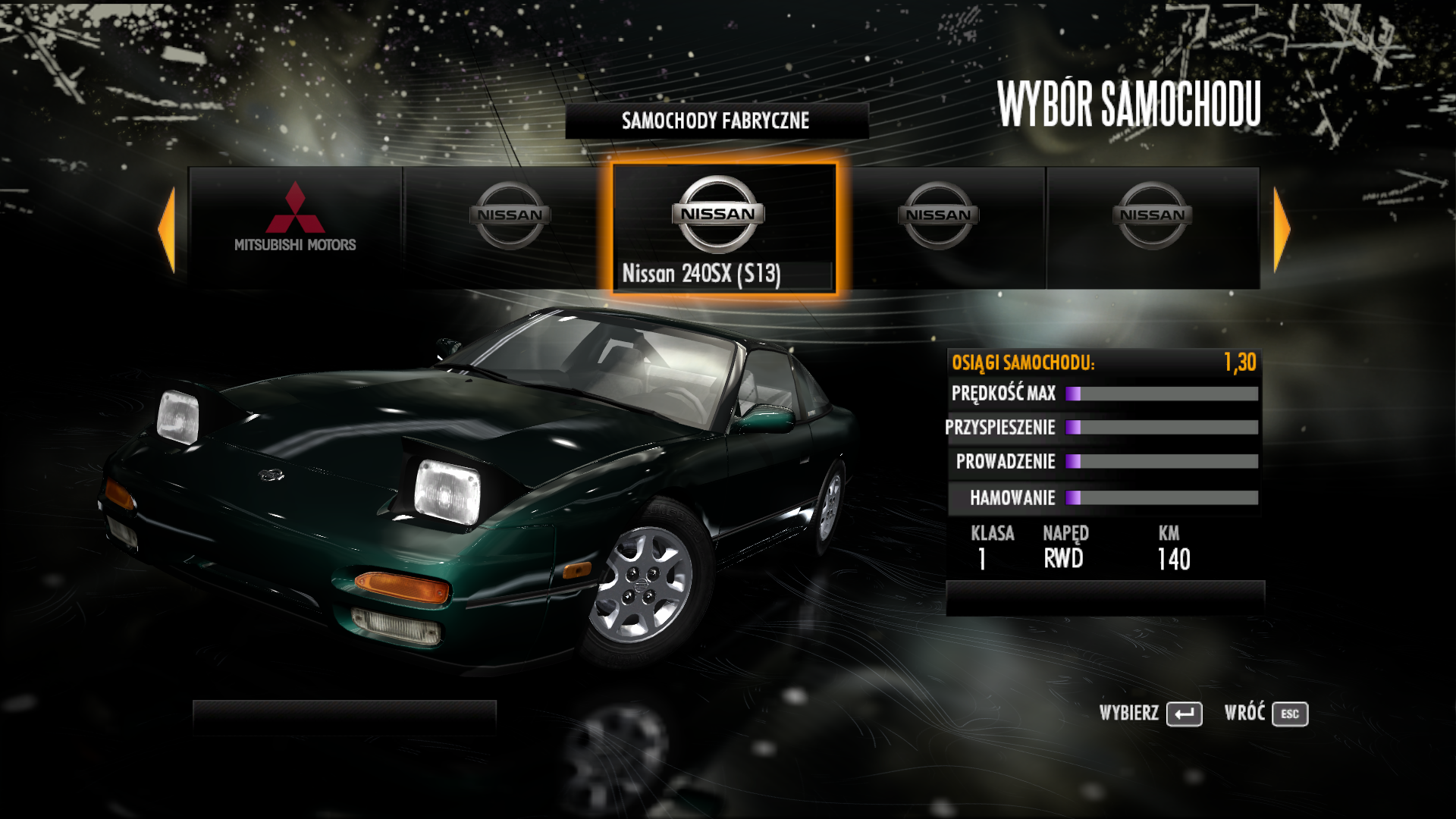 | Nissan 240SX (S13) | 1 | Japońska | 18,000 | RWD | ✓ | Dostępny od początku | Podstawowa wersja gry |