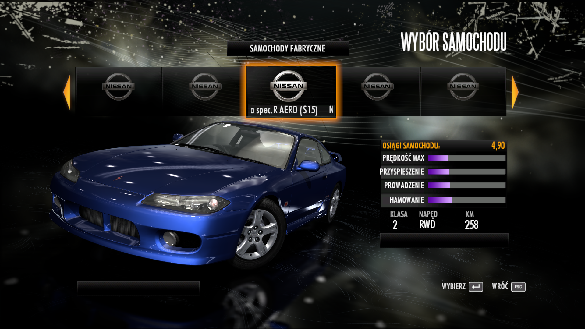 | Nissan Silvia spec.R AERO (S15) | 2 | Japońska | 55,000 | RWD | ✓ | 30 gwiazdek | Podstawowa wersja gry |