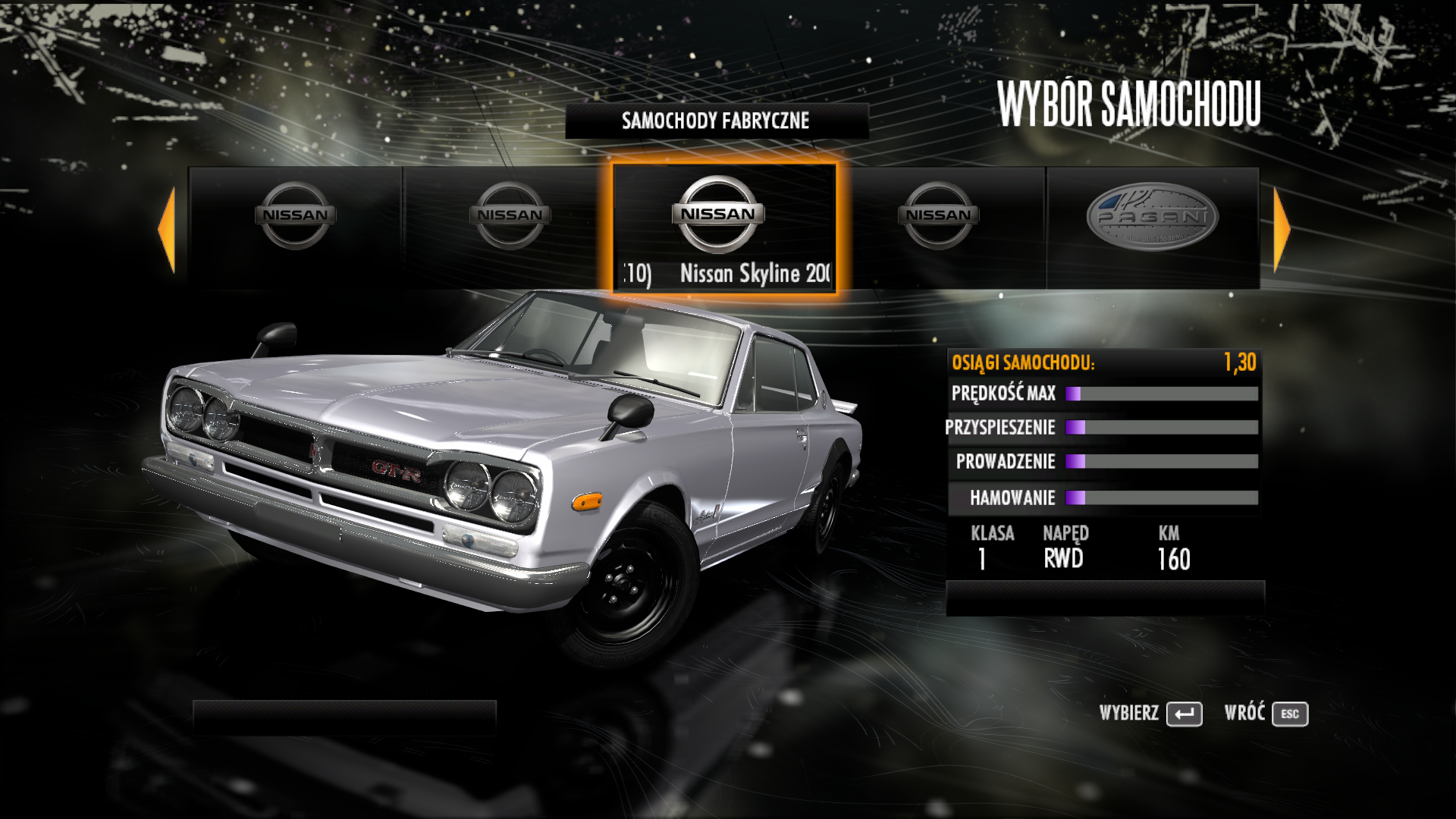 | Nissan Skyline 2000GT-R (C10) | 1 | Japońska | 18,000 | RWD | Dostępny od początku | Podstawowa wersja gry | |