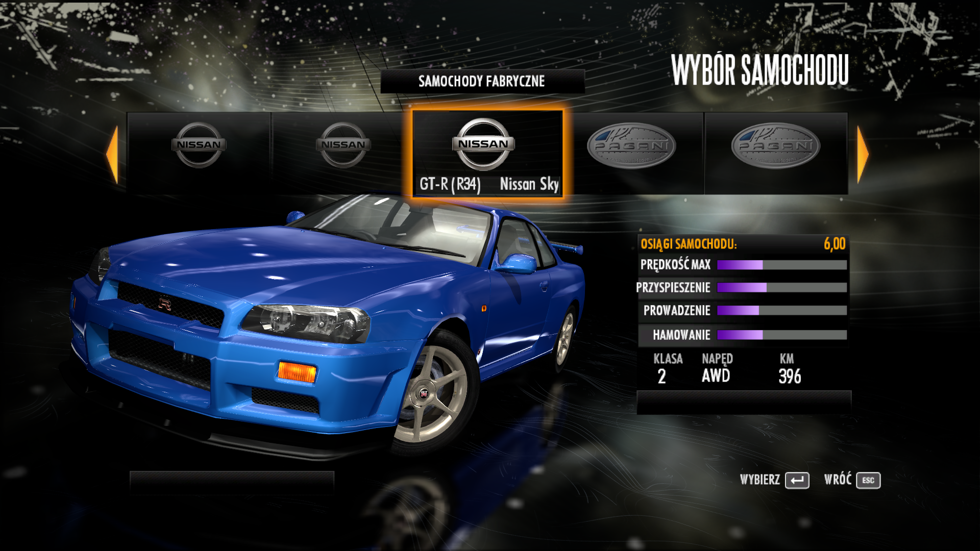 | Nissan Skyline GT-R (R34) | 2 | Japońska | 70,000 | AWD | 30 gwiazdek | Podstawowa wersja gry | |