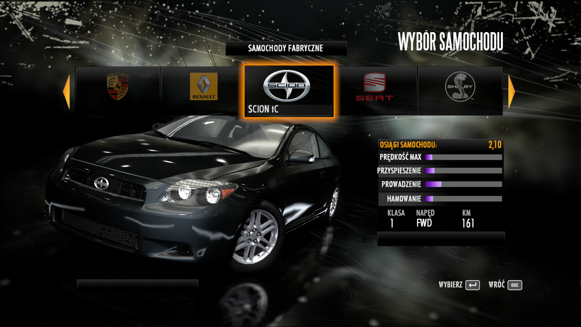 | Scion tC | 1 | Amerykańska | 20,000 | FWD | Dostępny od początku | Podstawowa wersja gry | |