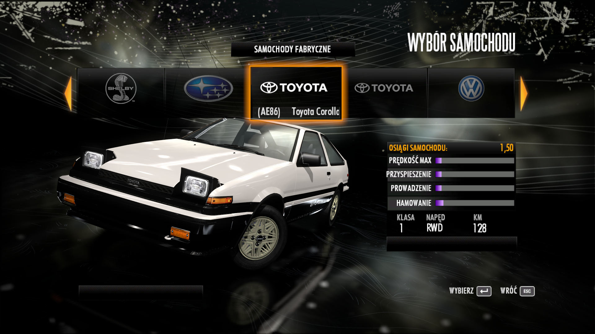 | Toyota Corolla GTS (AE86) | 1 | Japońska | 18,000 | RWD | ✓ | Dostępny od początku | Podstawowa wersja gry |