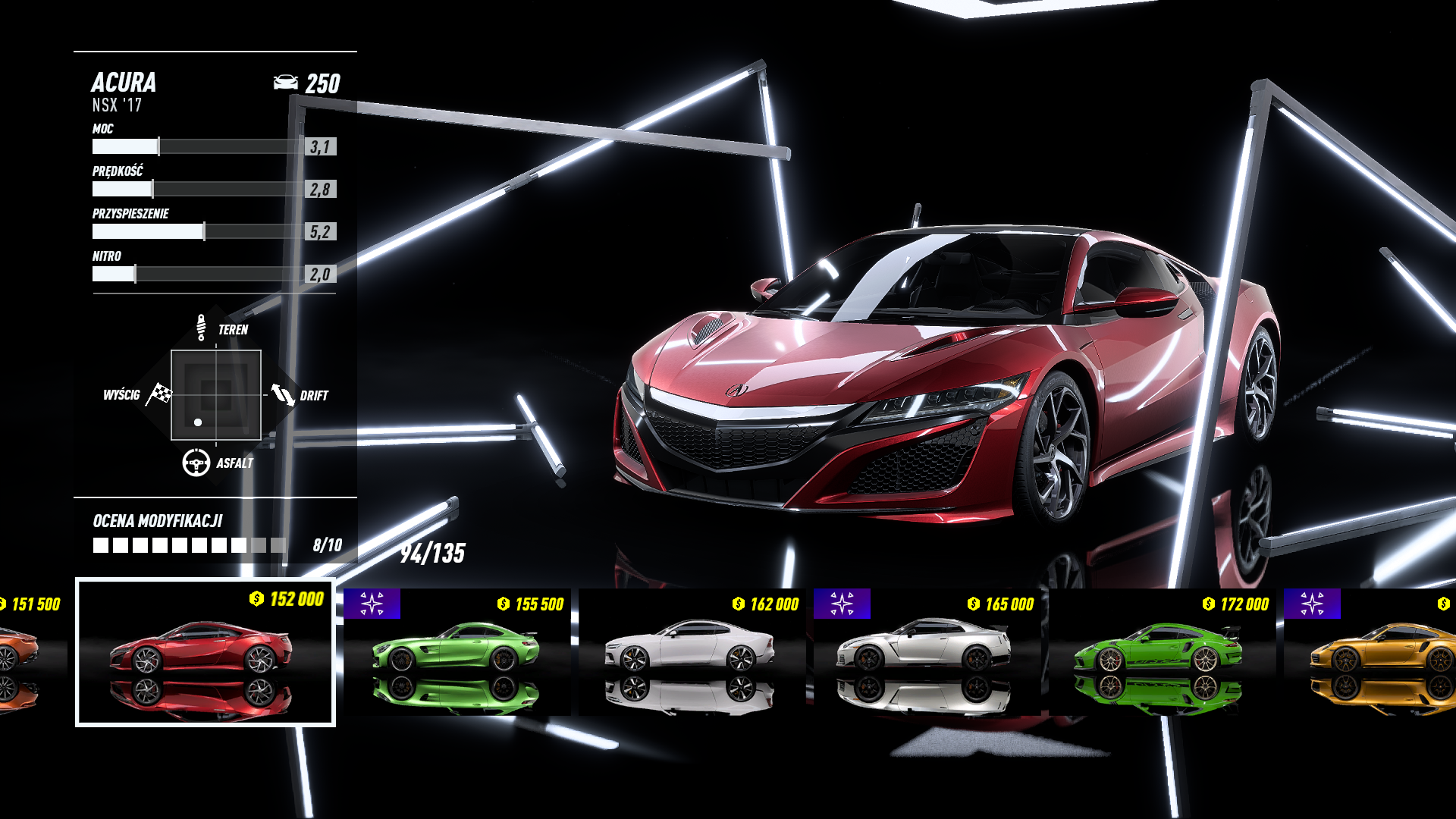 | Acura NSX | 2017 | Sportowy | 250 | 152,000 | 573 | 1239 | 8/10 | Osiągnij 22 poziom REP | Podstawowa wersja gry | |