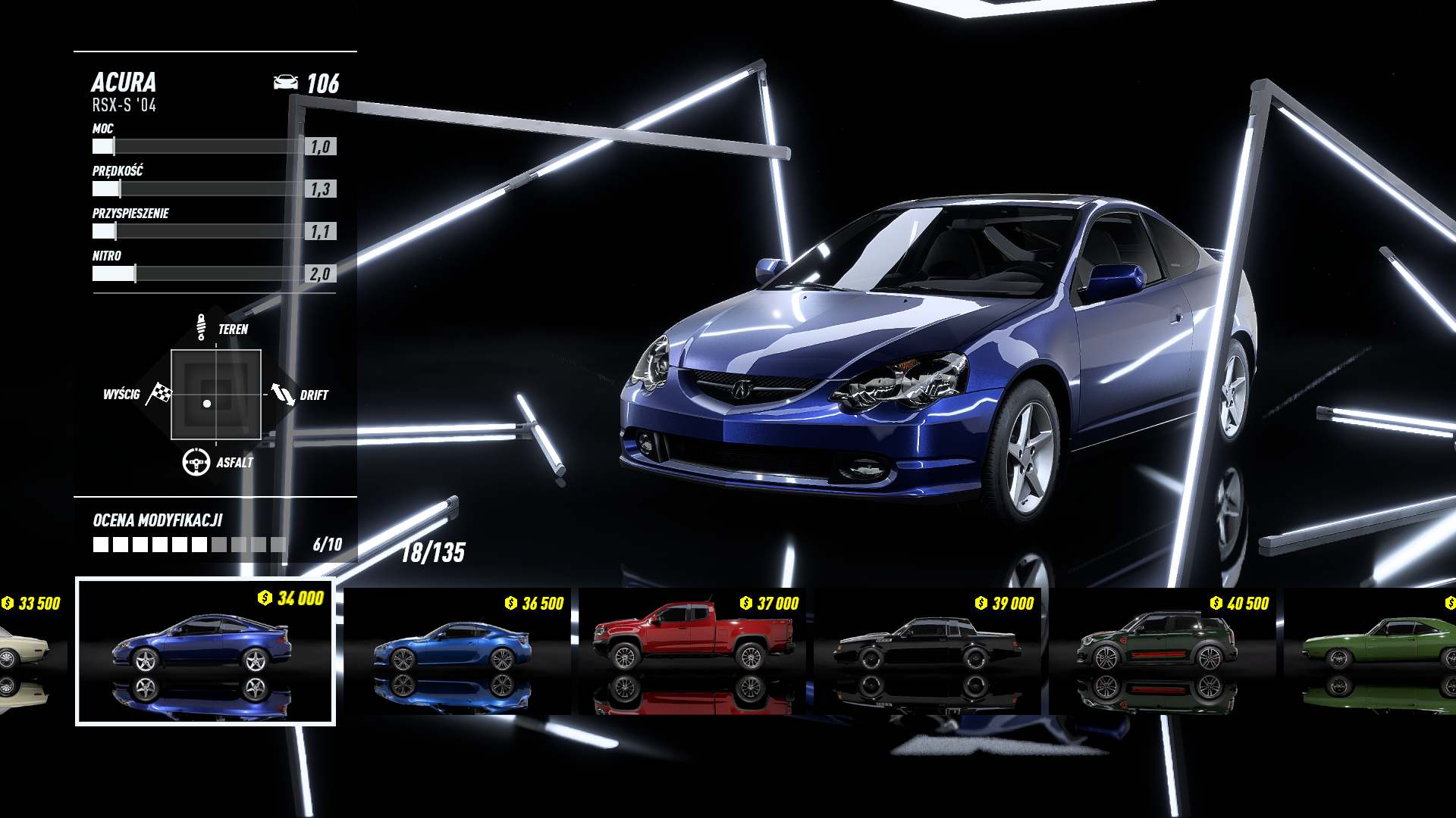 | Acura RSX-S | 2004 | Coupé | 106 | 34,000 | 200 | 583 | 6/10 | Osiągnij 20 poziom REP | Podstawowa wersja gry | |