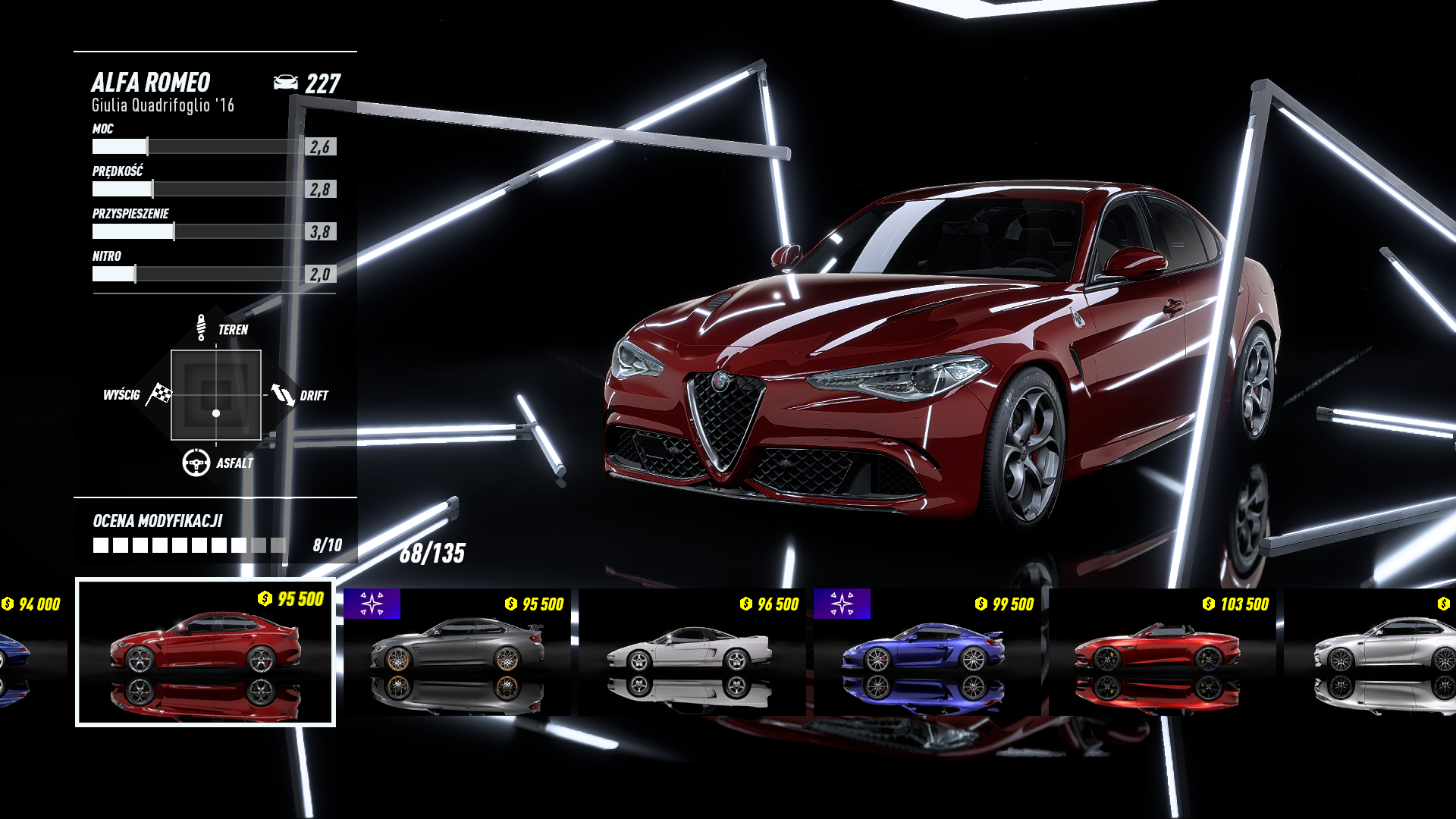| Alfa Romeo Giulia Quadrofoglio | 2016 | Wyczynowy | 227 | 95,500 | 503 | 905 | 8/10 | Osiągnij 18 poziom REP | Podstawowa wersja gry | |