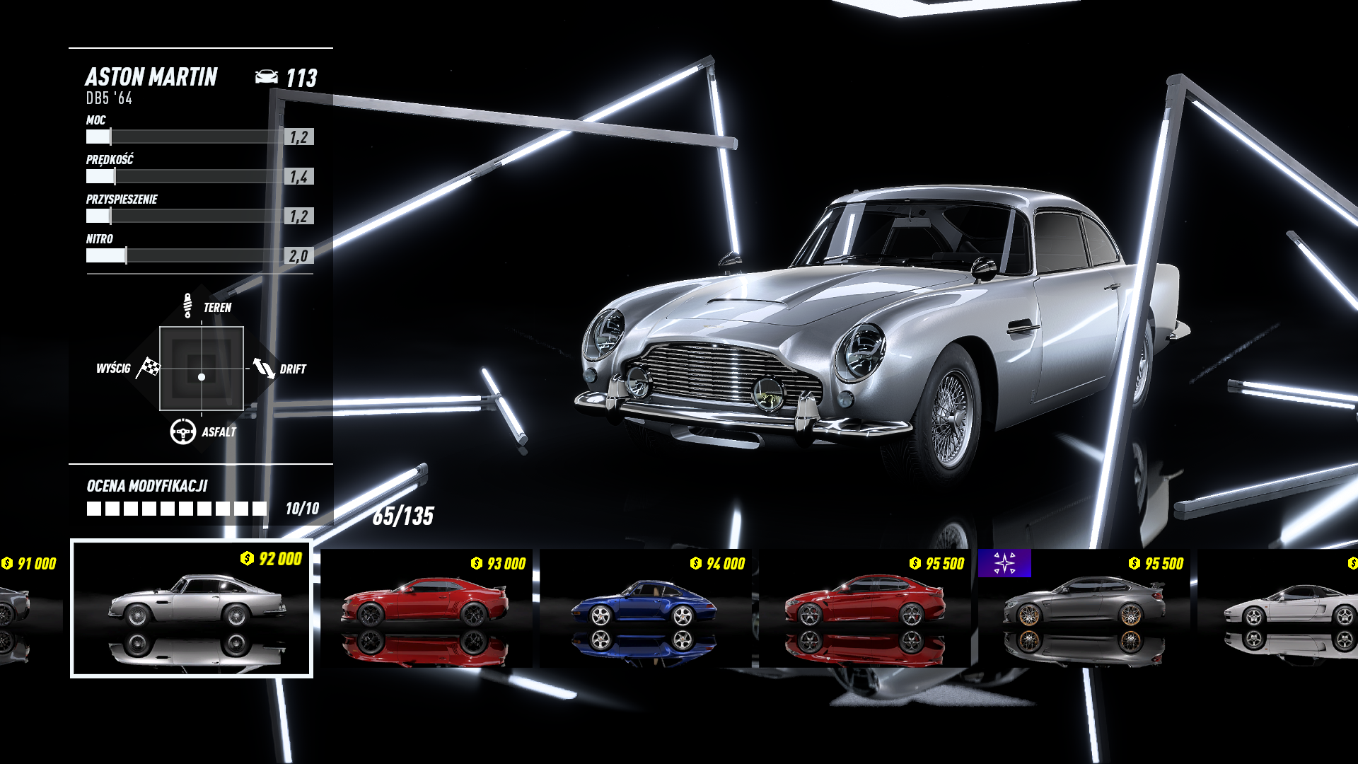| Aston Martin DB5 | 1964 | Klasyczny | 113 | 92,000 | 282 | 1017 | 10/10 | Osiągnij 12 poziom REP | Podstawowa wersja gry | |