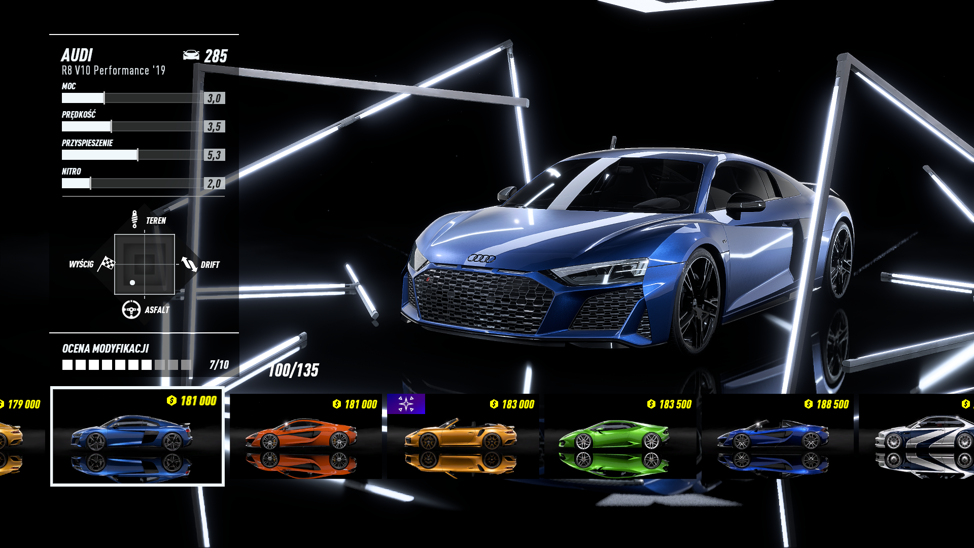 | Audi R8 V10 Performance | 2019 | Supersamochód | 285 | 181,000 | 612 | 1235 | 7/10 | Osiągnij 28 poziom REP | Podstawowa wersja gry | |