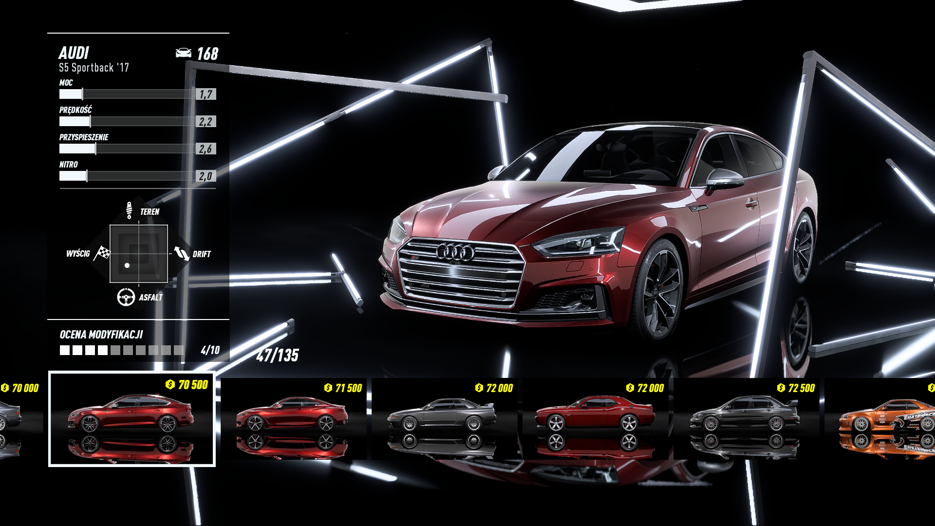 | Audi S5 Sportback | 2017 | Wyczynowy | 168 | 70,500 | 349 | 807 | 4/10 | Osiągnij 8 poziom REP | Podstawowa wersja gry | |