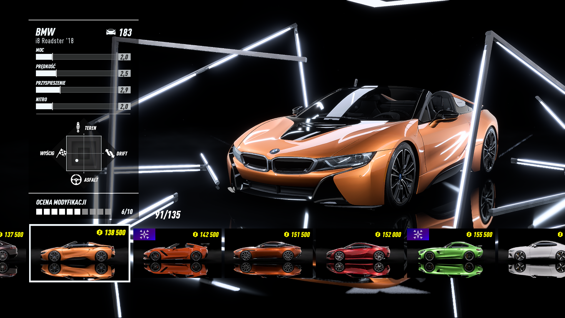 | BMW i8 Roadster | 2018 | Kabriolet | 183 | 138,500 | 369 | 660 | 6/10 | Osiągnij 20 poziom REP | Podstawowa wersja gry | |