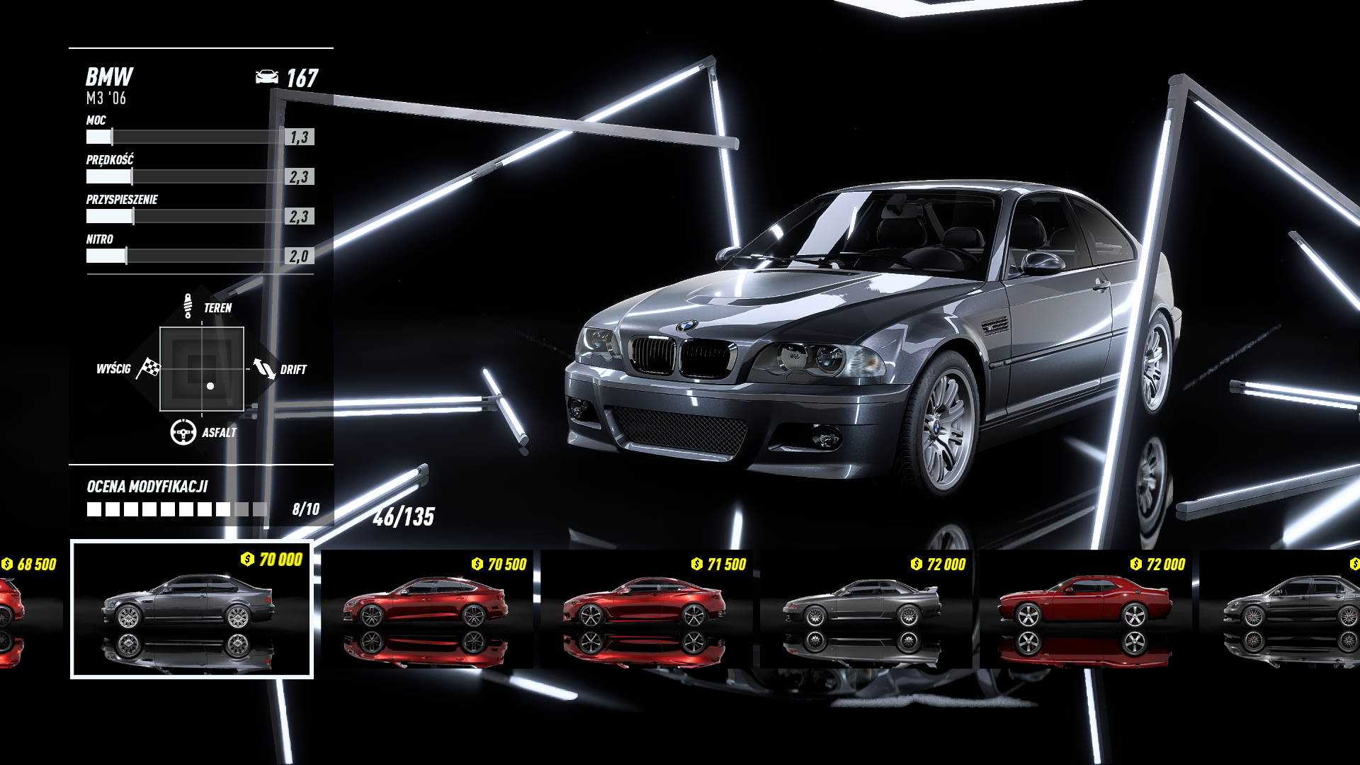 | BMW M3 | 2006 | Wyczynowy | 167 | 70,000 | 338 | 861 | 8/10 | Osiągnij 7 poziom REP | Podstawowa wersja gry | |