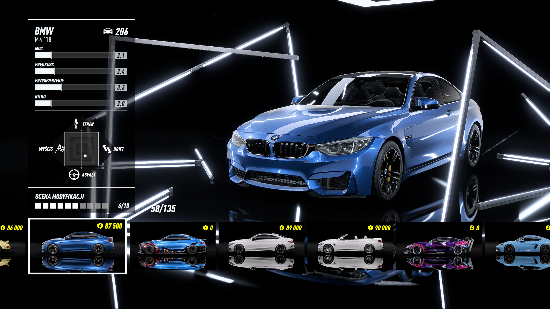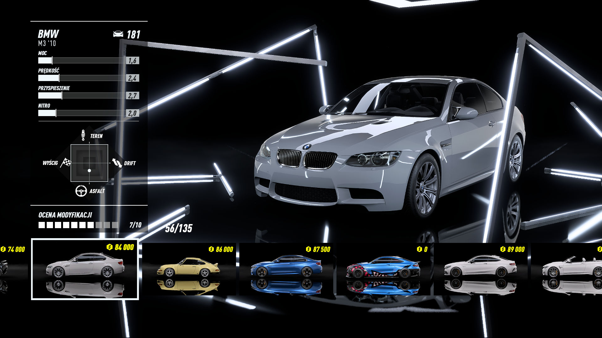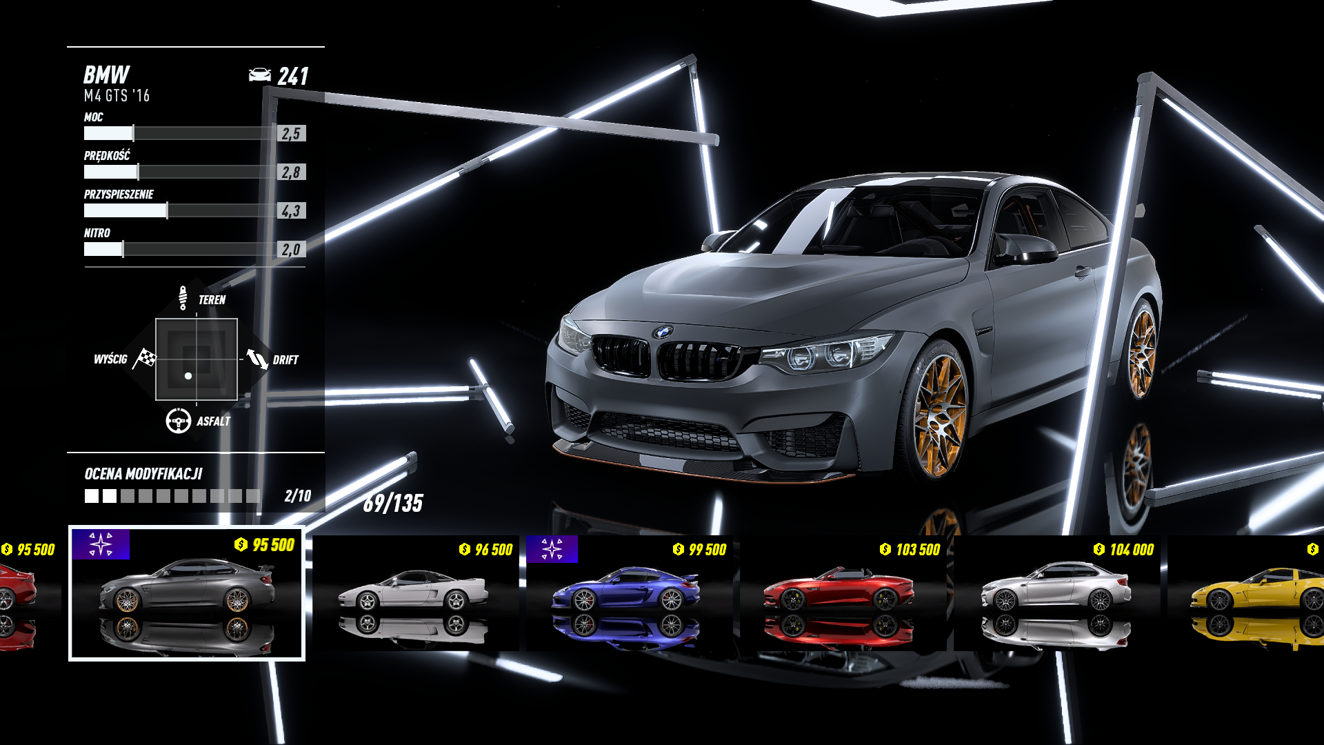 | BMW M4 GTS | 2016 | Wyczynowy | 241 | 87,500 | 494 | 884 | 2/10 | Zdobądź 3 gwiazdki we wszystkich strefach driftu | Podstawowa wersja gry | |