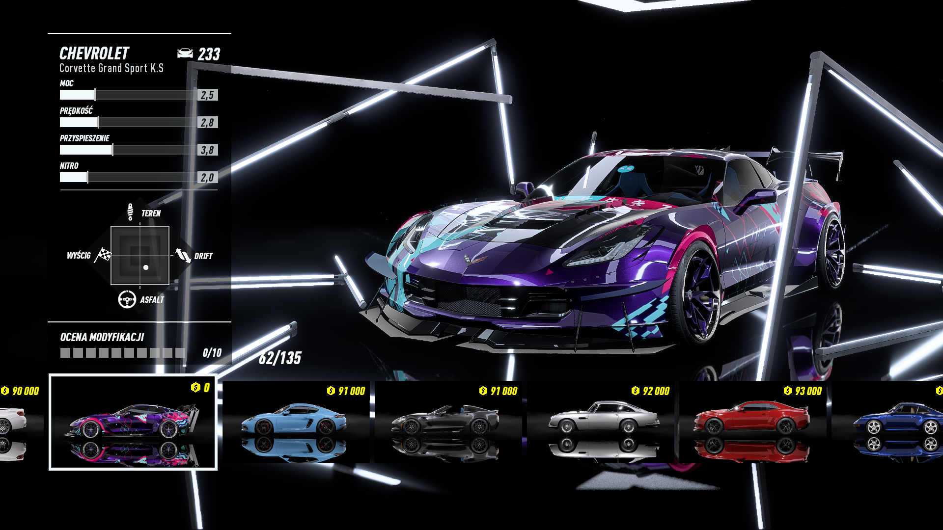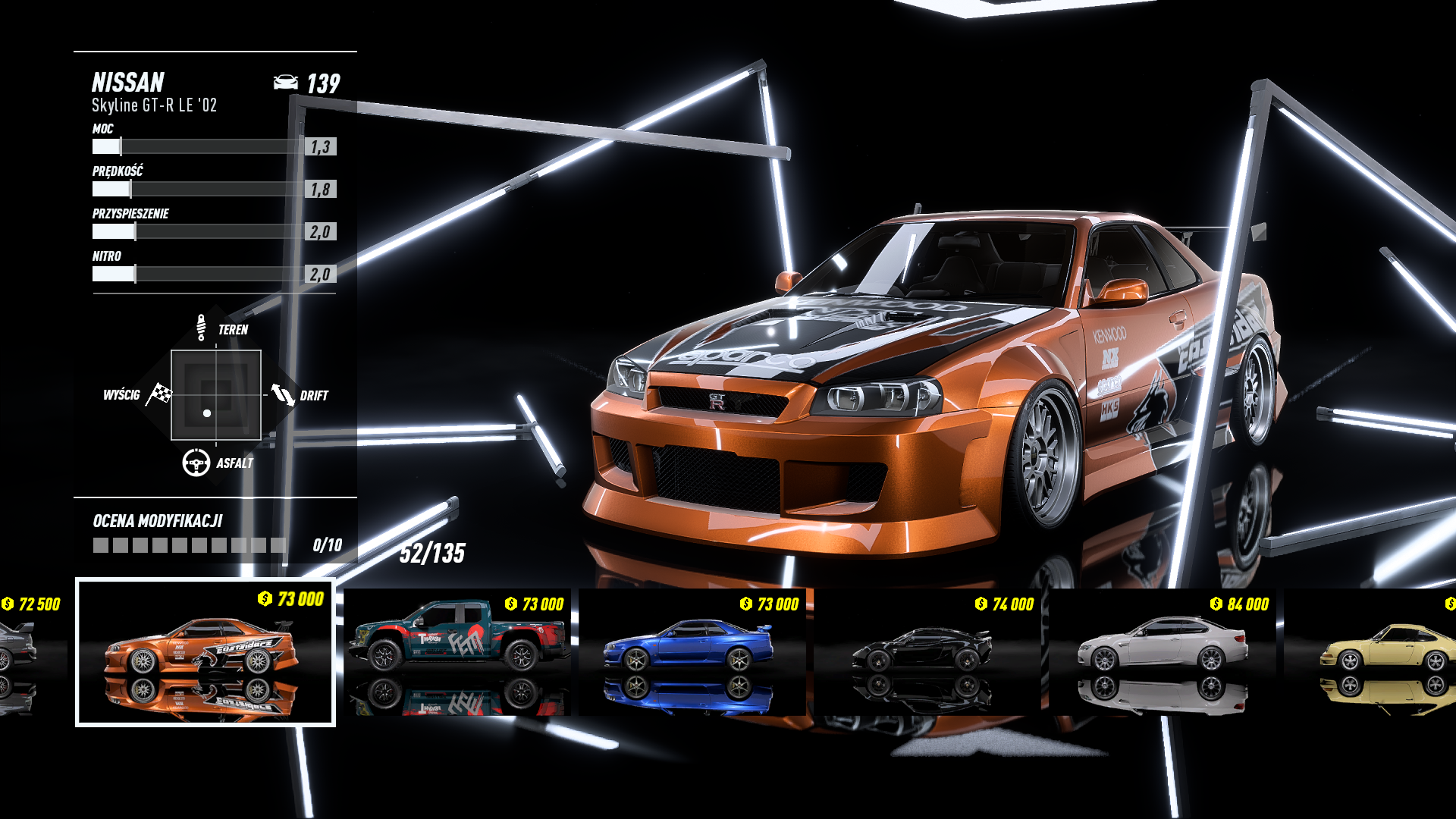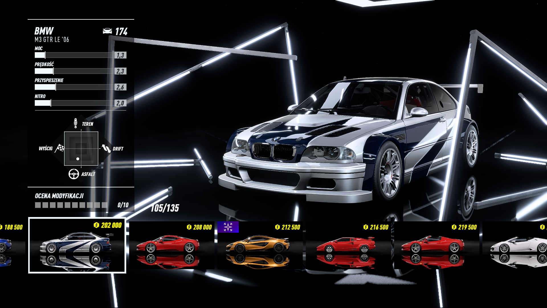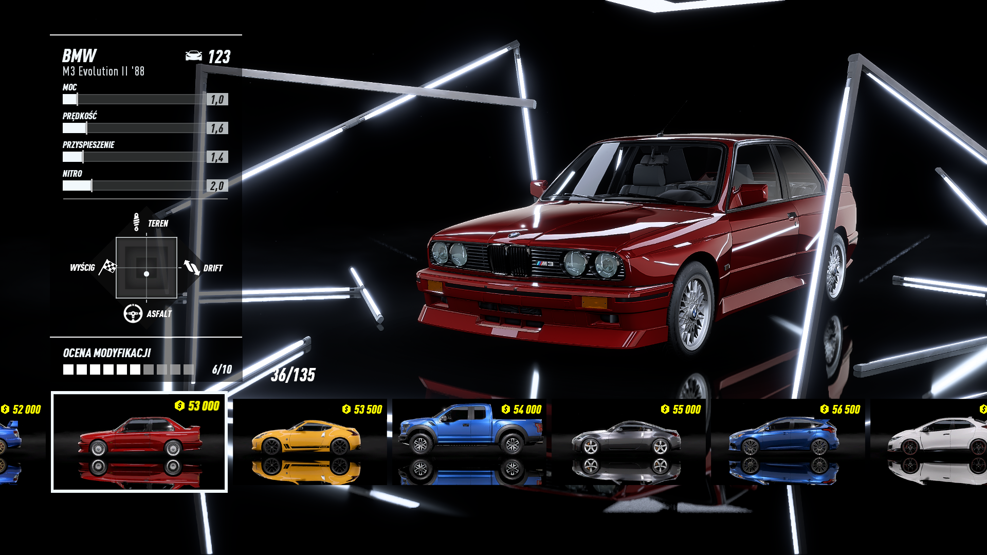 | BMW M4 GTS | 2016 | Wyczynowy | 241 | 87,500 | 494 | 884 | 2/10 | Zdobądź 3 gwiazdki we wszystkich strefach driftu | Podstawowa wersja gry | |