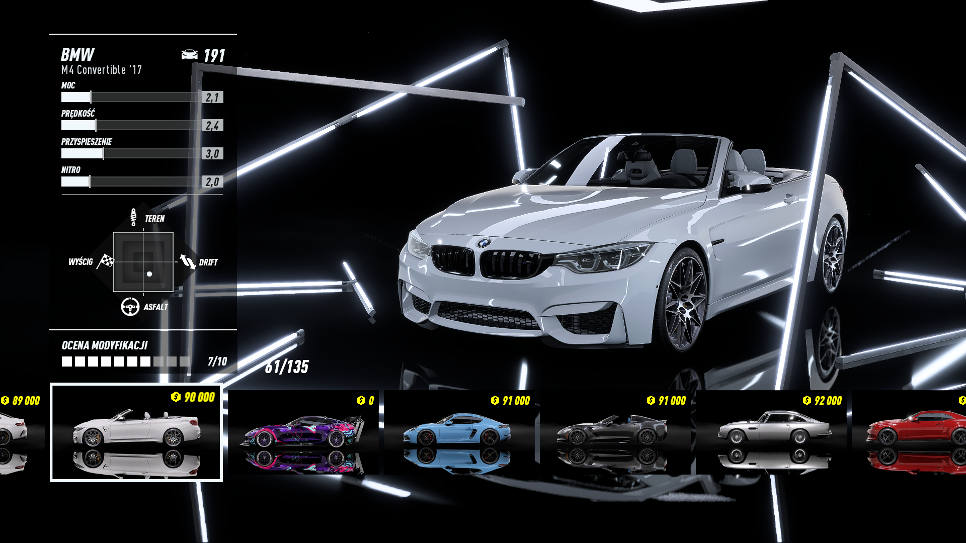 | BMW M4 Convertible | 2017 | Kabriolet | 191 | 90,000 | 425 | 800 | 7/10 | Osiągnij 16 poziom REP | Podstawowa wersja gry | |