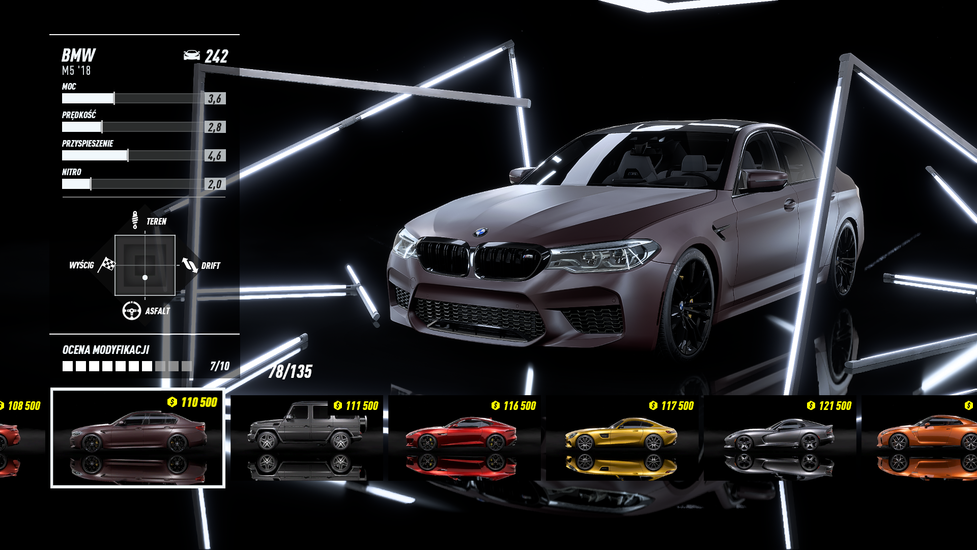 | BMW M5 | 2018 | Wyczynowy | 242 | 110,500 | 591 | 1120 | 7/10 | Osiągnij 20 poziom REP | Podstawowa wersja gry | |