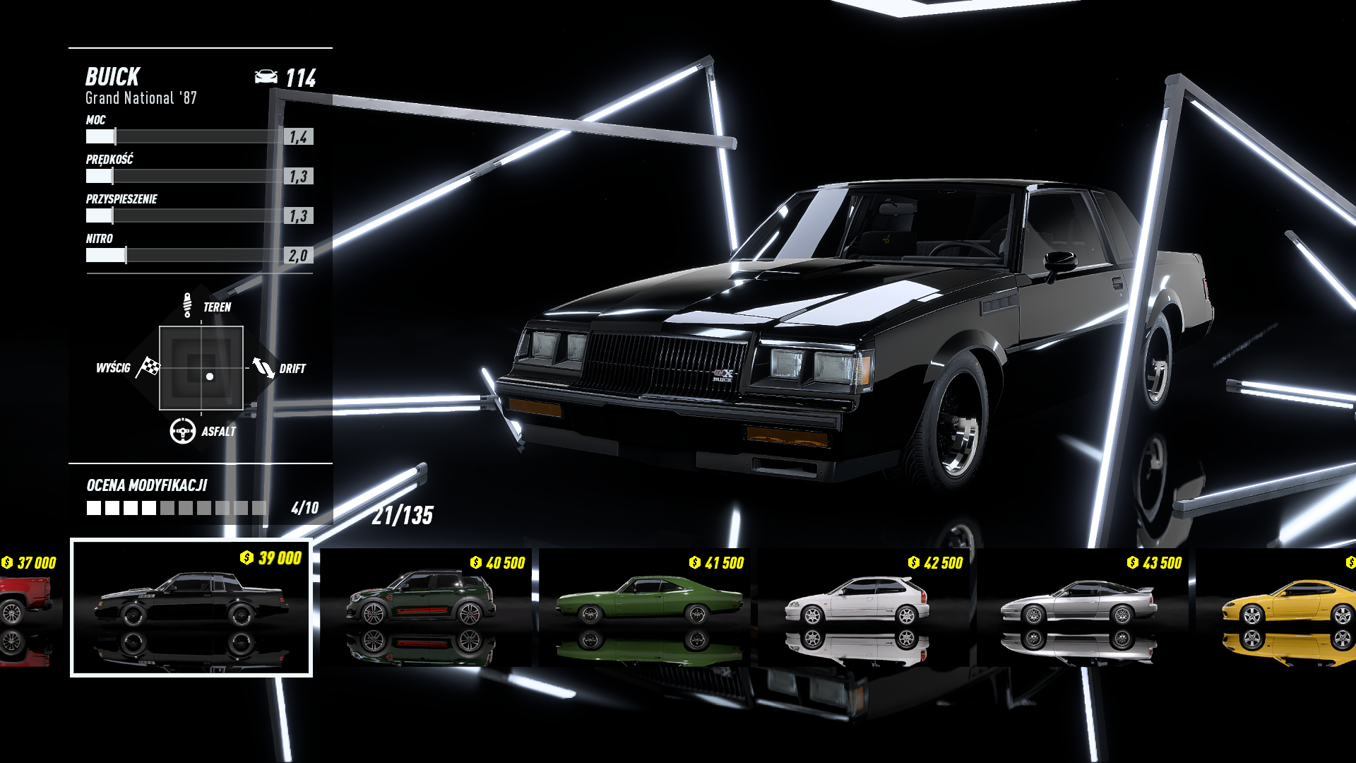 | Buick Grand National | 1987 | Muscle car | 114 | 39,000 | 245 | 975 | 4/10 | Osiągnij 12 poziom REP | Podstawowa wersja gry | |