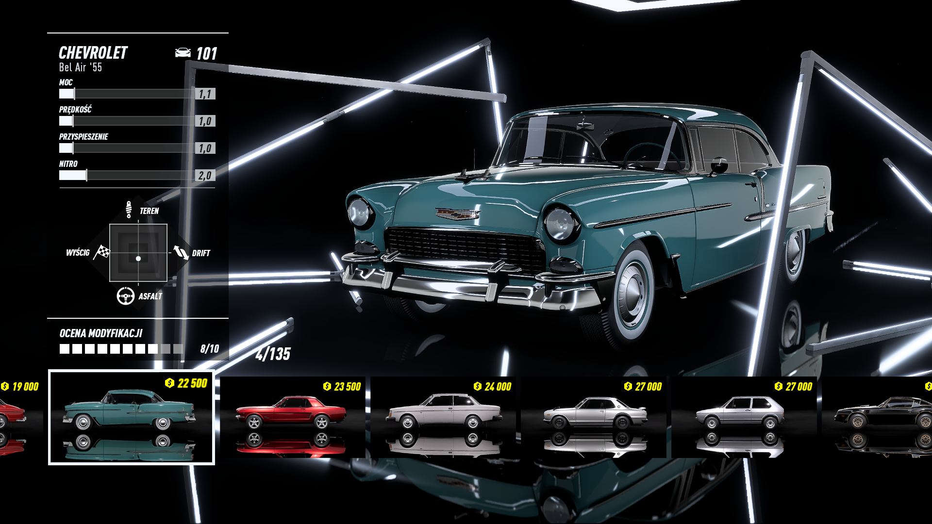 | Chevrolet Bel Air | 1955 | Klasyczny | 101 | 22,500 | 180 | 988 | 8/10 | Osiągnij 20 poziom REP | Podstawowa wersja gry | |