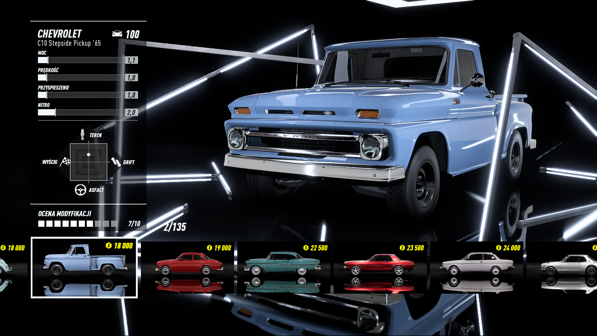 | Chevrolet C10 Stepside Pickup | 1965 | Klasyczny | 100 | 18,000 | 175 | 1145 | 7/10 | Osiągnij 16 poziom REP | Podstawowa wersja gry | |