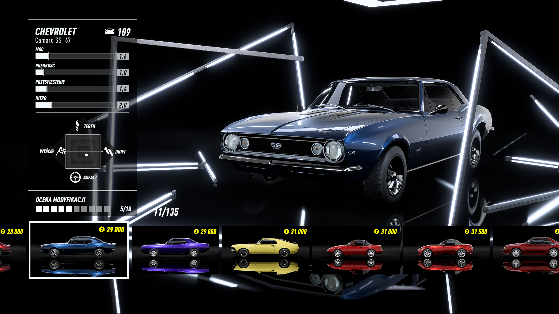 | Chevrolet Camaro SS | 1967 | Klasyczny | 109 | 29,000 | 295 | 1239 | 5/10 | Osiągnij 12 poziom REP | Podstawowa wersja gry | |