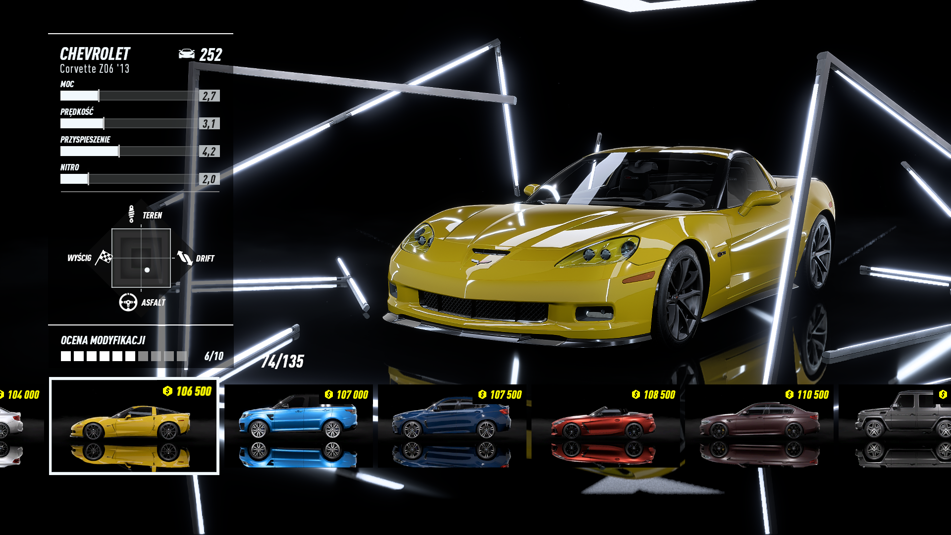 | Chevrolet Corvette Z06 | 2013 | Sportowy | 252 | 106,500 | 506 | 1238 | 6/10 | Osiągnij 22 poziom REP | Podstawowa wersja gry | |