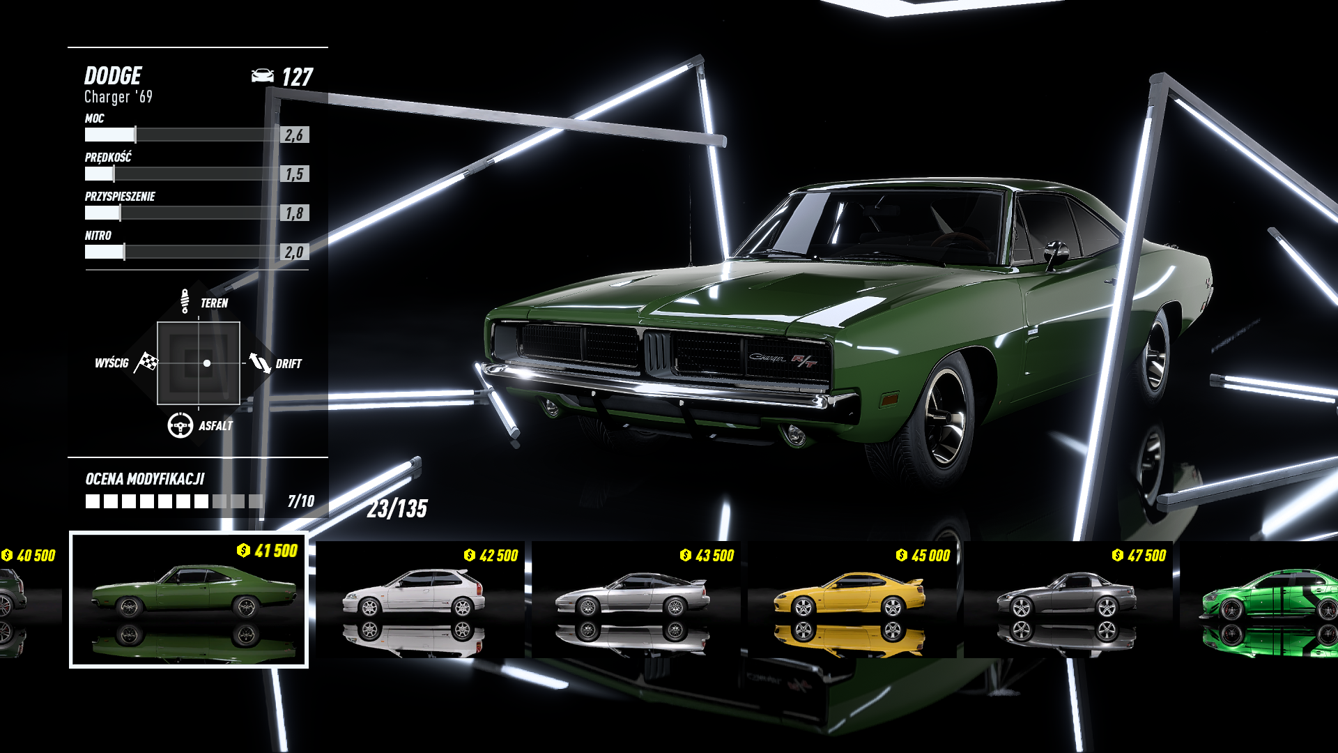 | Dodge Charger | 1969 | Klasyczny | 127 | 41,500 | 425 | 1239 | 7/10 | Dostępny od początku | Podstawowa wersja gry | |