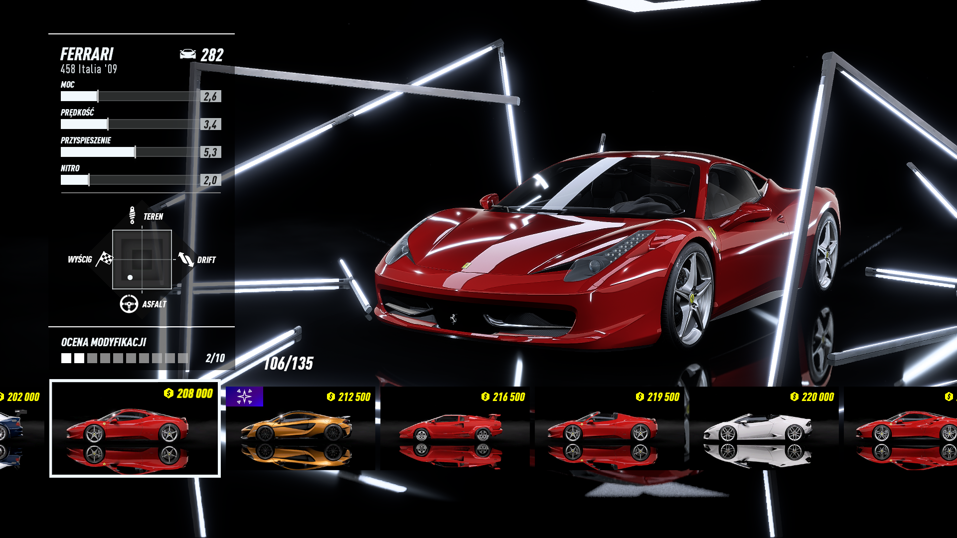 | Ferrari 458 Italia | 2009 | Supersamochód | 282 | 208,000 | 570 | 1118 | 2/10 | Osiągnij 28 poziom REP | Podstawowa wersja gry | |