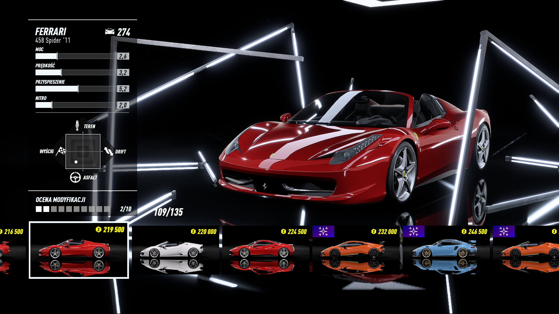 | Ferrari 458 Spider | 2011 | Supersamochód | 274 | 219,500 | 570 | 1118 | 2/10 | Osiągnij 24 poziom REP | Podstawowa wersja gry | |