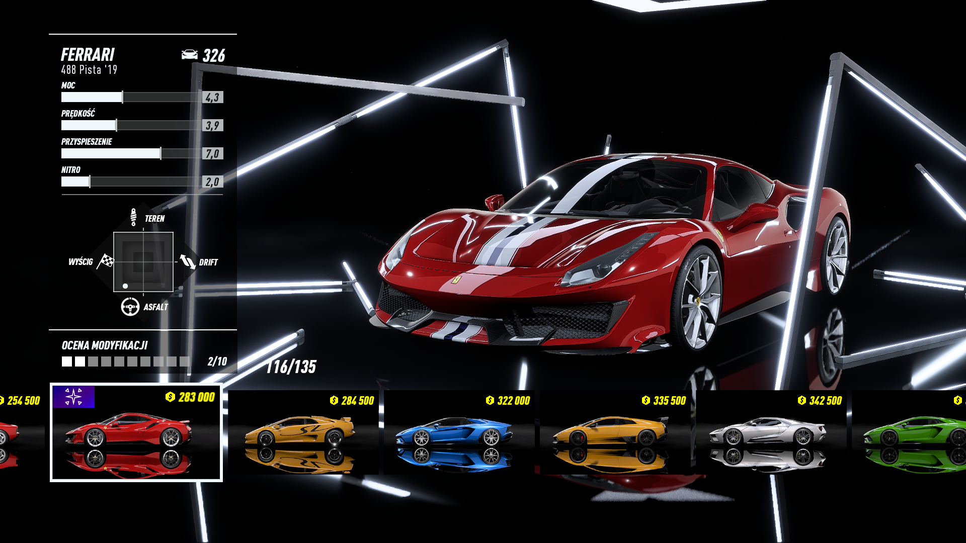 | Ferrari 488 Pista | 2019 | Supersamochód | 326 | 283,000 | 710 | 1234 | 2/10 | Zbierz wszystkie przedmioty i zdobądź 3 gwiazdki w każdej misji | Podstawowa wersja gry | |