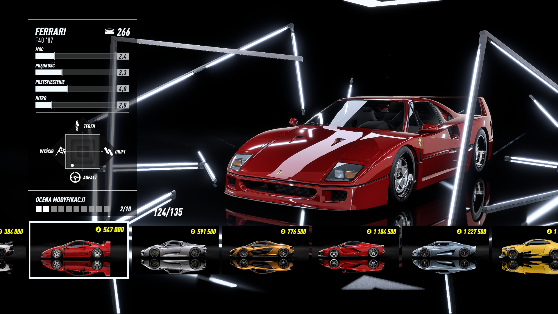 | Ferrari F40 | 1987 | Supersamochód | 266 | 547,000 | 471 | 851 | 2/10 | Osiągnij 24 poziom REP | Podstawowa wersja gry | |