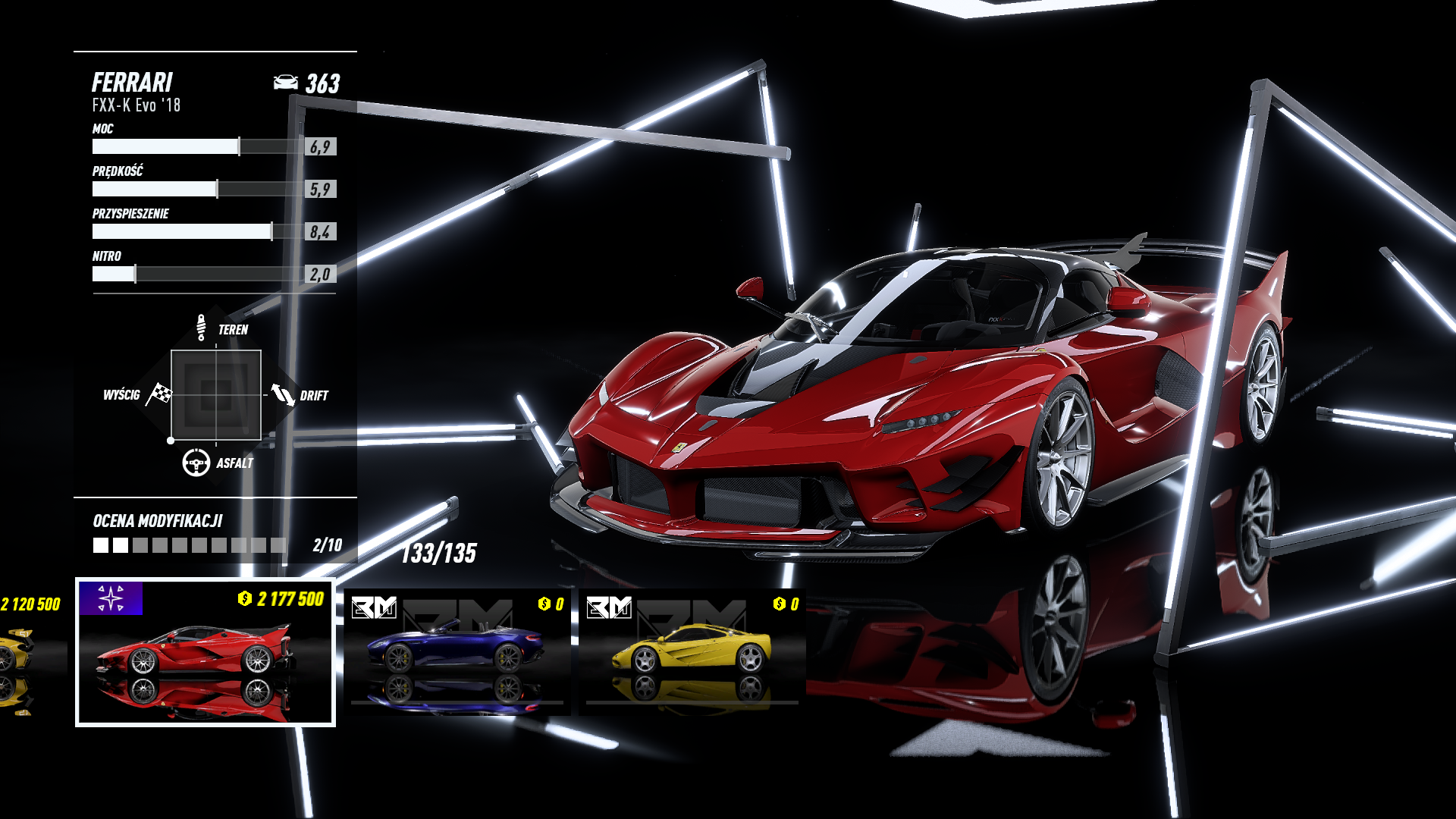 | Ferrari FXX-K Evo | 2018 | Hipersamochód | 363 | 2,177,500 | 1035 | 1446 | 2/10 | Dostępny dla członka ekipy 50. poz. | Podstawowa wersja gry | |